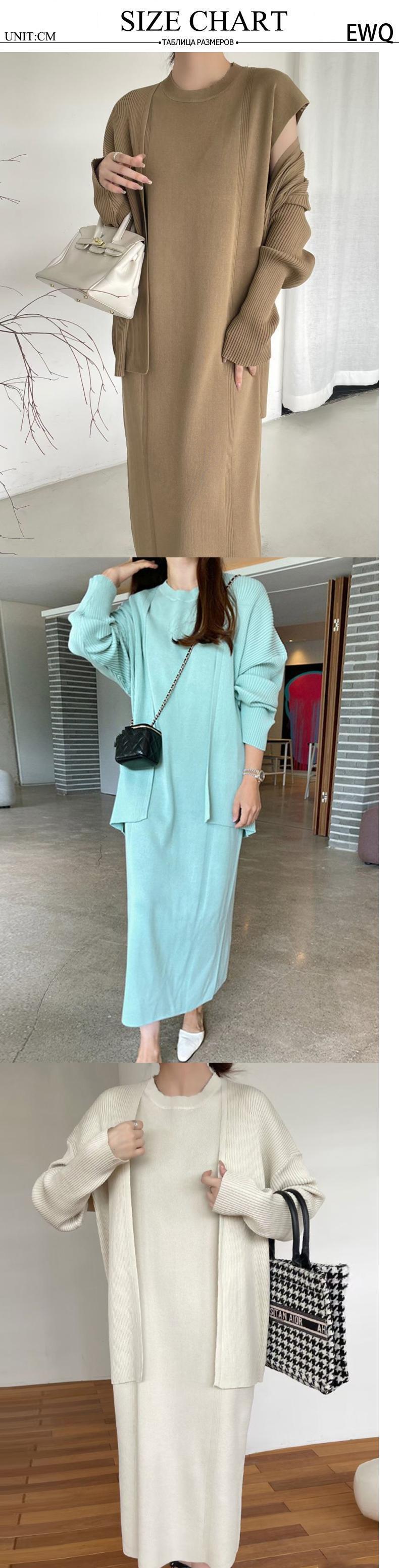 [EWQ] ニットツーピーススーツ長袖カーディガンコート + O ネックルーズニットドレス秋潮セット U1265 ロング オータム 秋物 Oネック