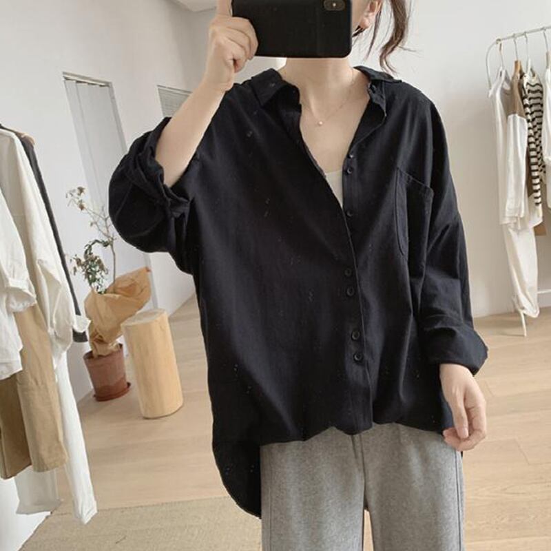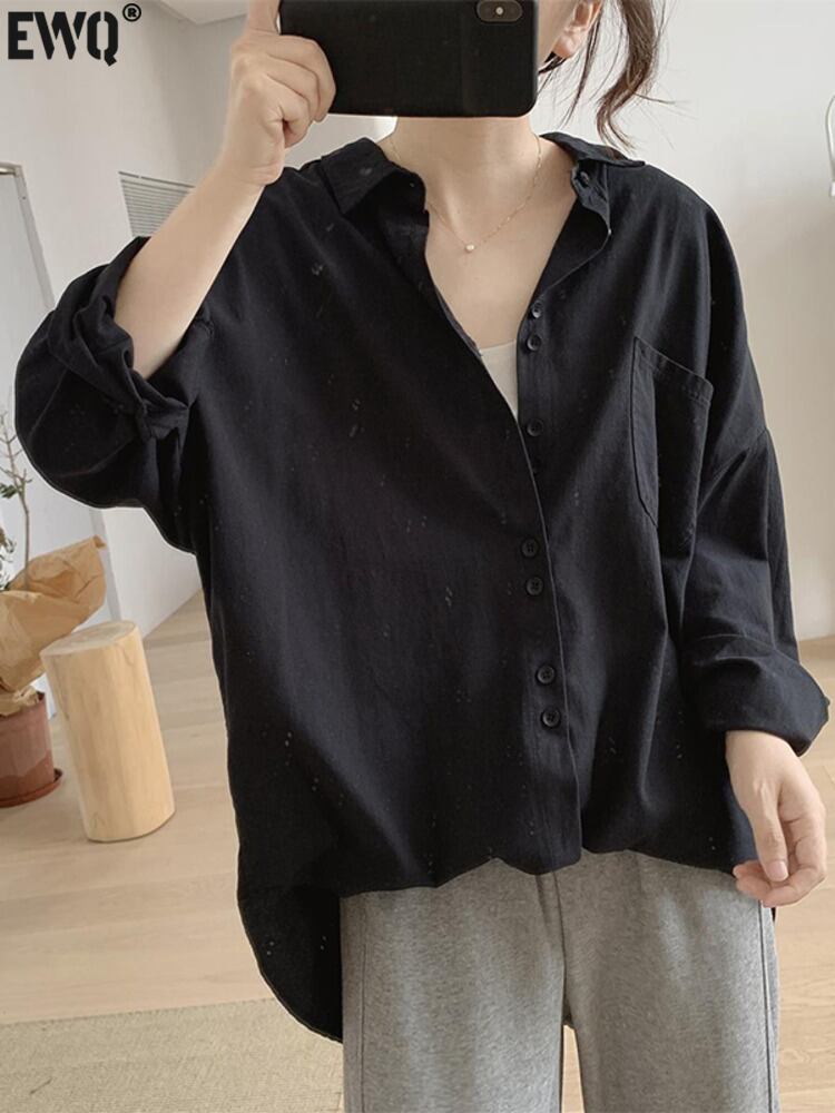 [EWQ] ビッグサイズシンプル白シャツ長袖ルーズシングルブレスト秋潮トップ ロング ホワイト オータム 秋物