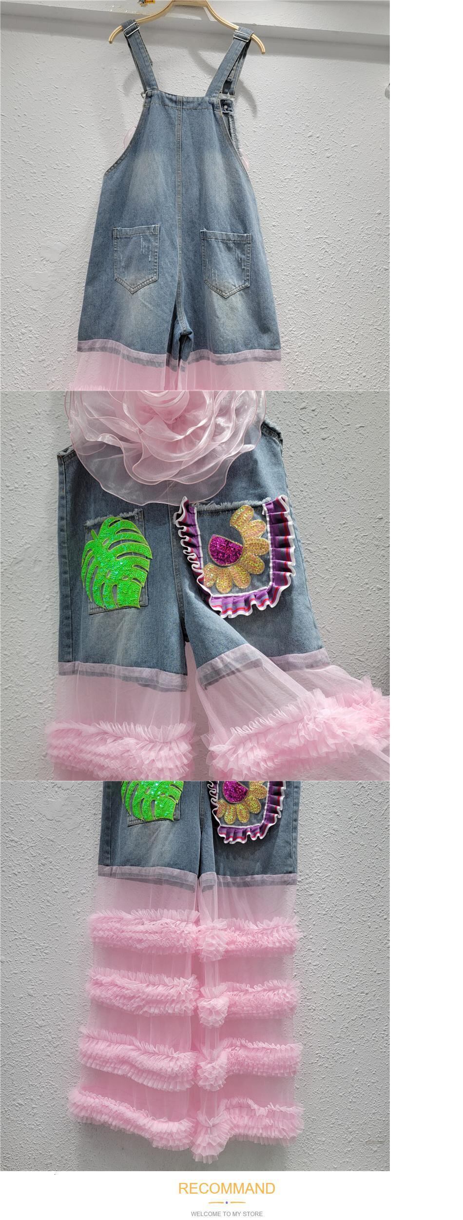 [EWQ] 3D メッシュフラワーピンクパッチワークストラップデニムパンツストリート裾ガーゼ透視オーバーオールジーンズ夏 U683 サマー 夏物 フラワーデザイン