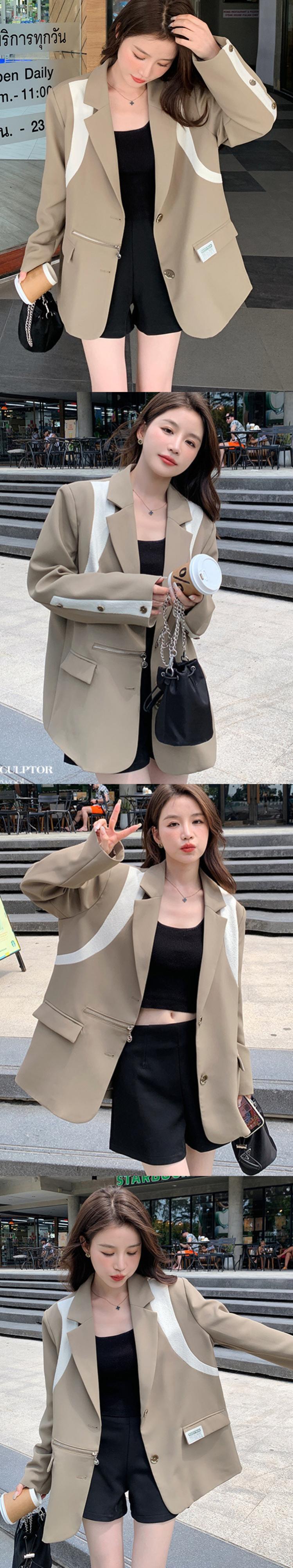 [EWQ] コントラストバックスプリットブレザーコート長袖ルーズシングルブレストポケットスーツジャケット秋潮 93 ロング オータム 秋物