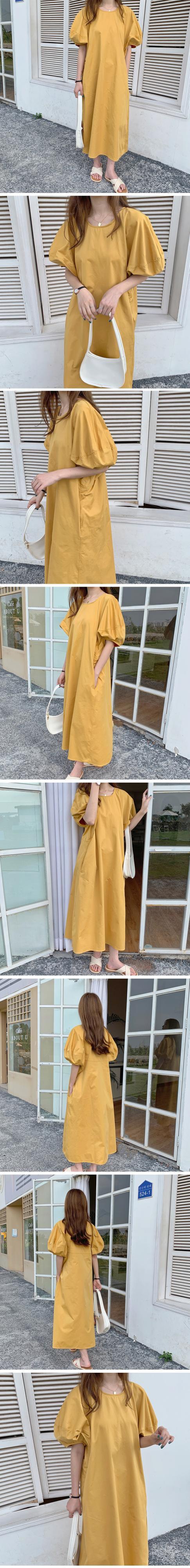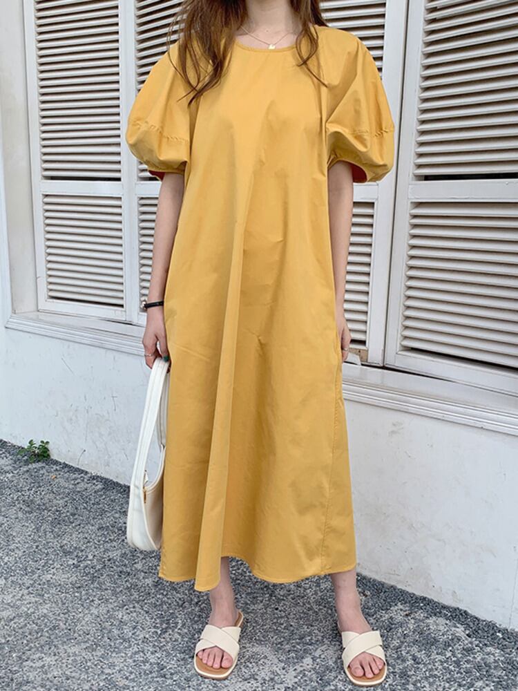 [EWQ] イエロー バブル スリーブ ルーズ カジュアル ドレス Womem サマー タイド O ネック ダブル ポケット Vestido 16U269 夏物 Oネック