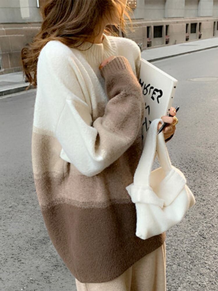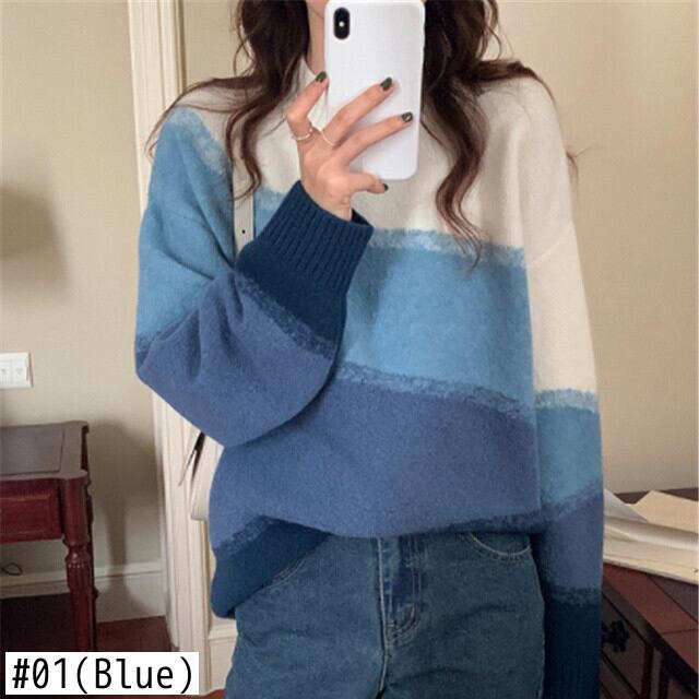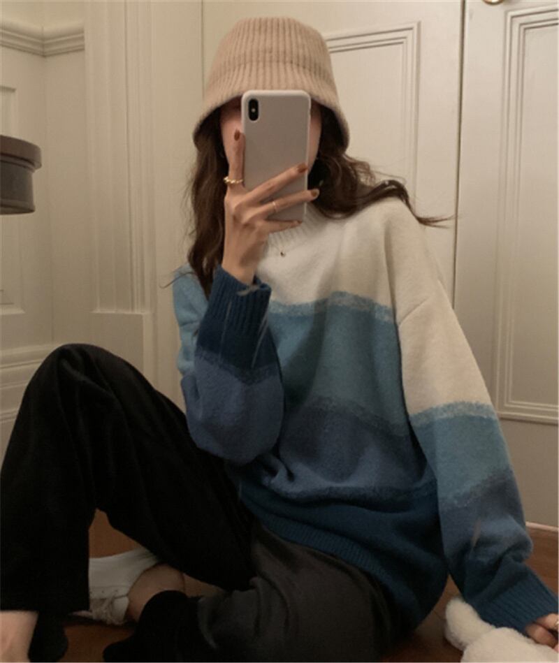 [EWQ] グラデーション長袖セーター秋潮ルーズOネックニットプルオーバーコントラストカラートップス ロング オータム 秋物