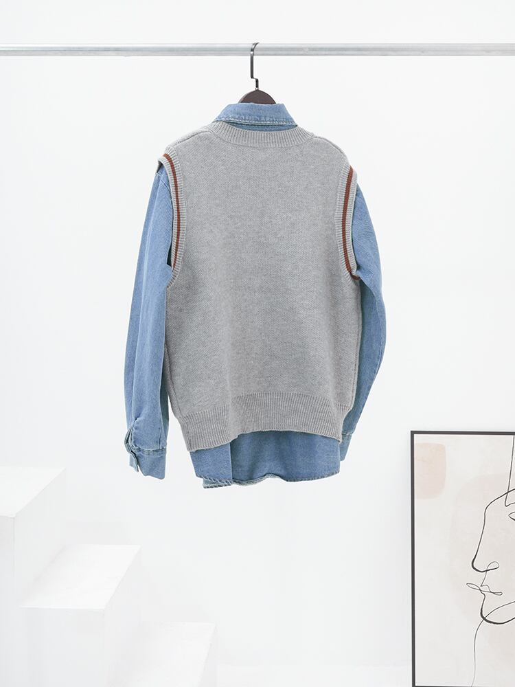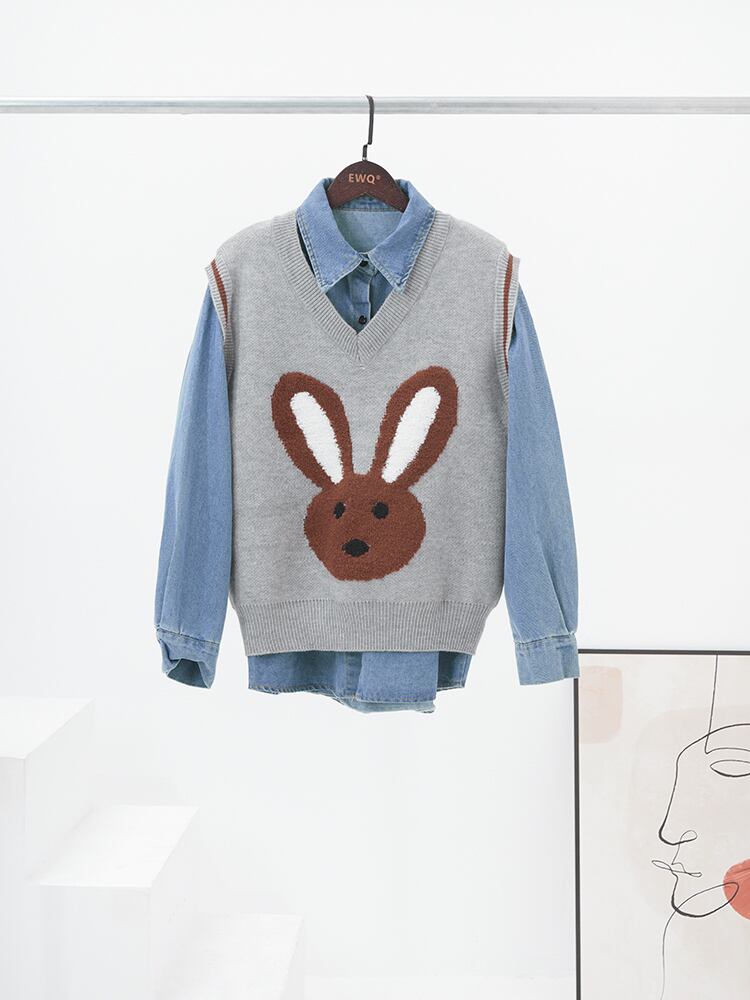 [EWQ] アニマルパッチワークフェイクツーピースセーター長袖ルーズデニムスプライスプルオーバーニット秋潮トップ U1132 ロング オータム 秋物