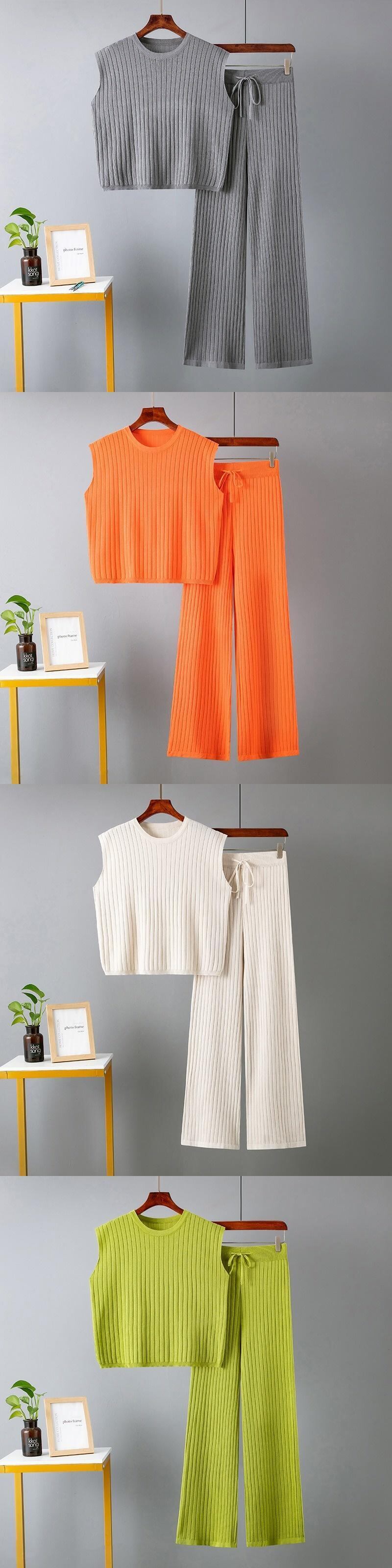[EWQ] ツーピースセットノースリーブニットスーツセーターベスト衣装ワイドレッグパンツトラックスーツ美しいツーピースセット ワイドパンツ