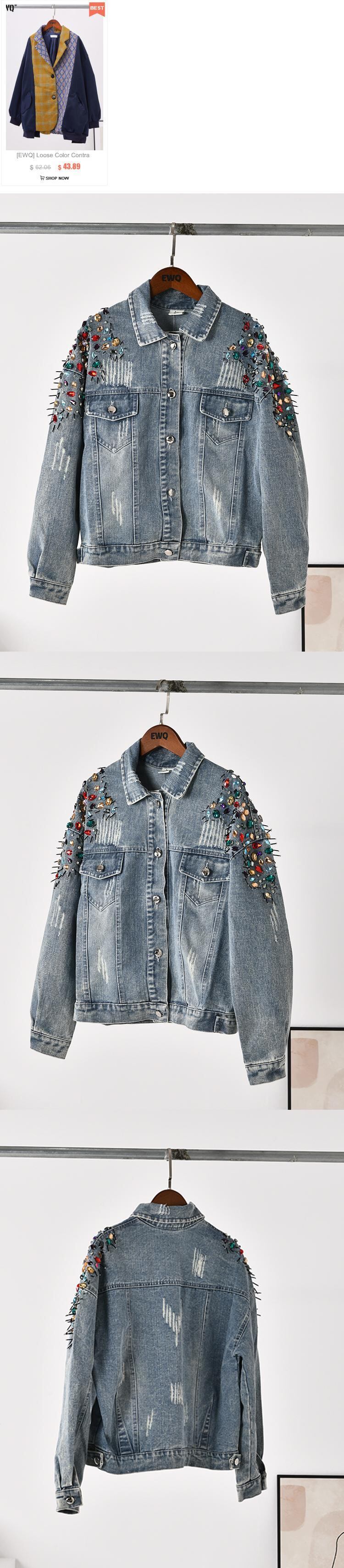 [EWQ] 長袖リベットカラフルダイヤモンドデニムジャケット秋潮シングルブレストジャケットコートアウター16U1298 ロング オータム 秋物