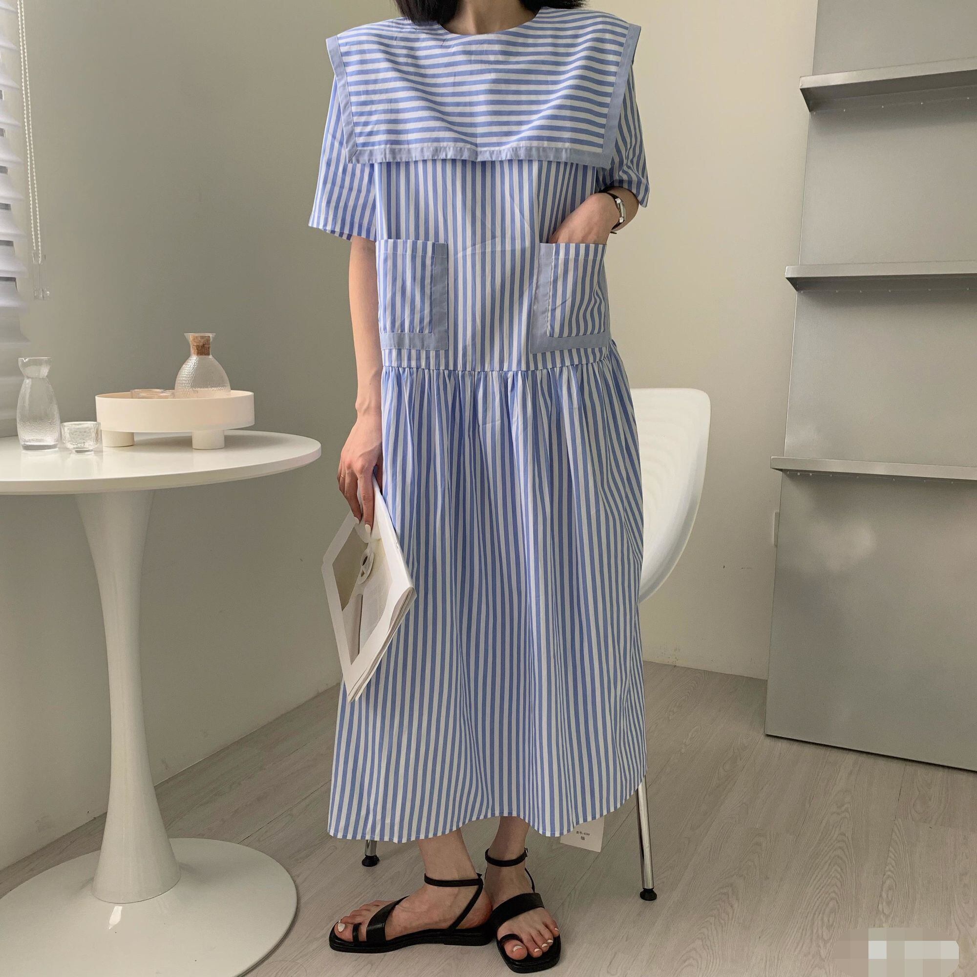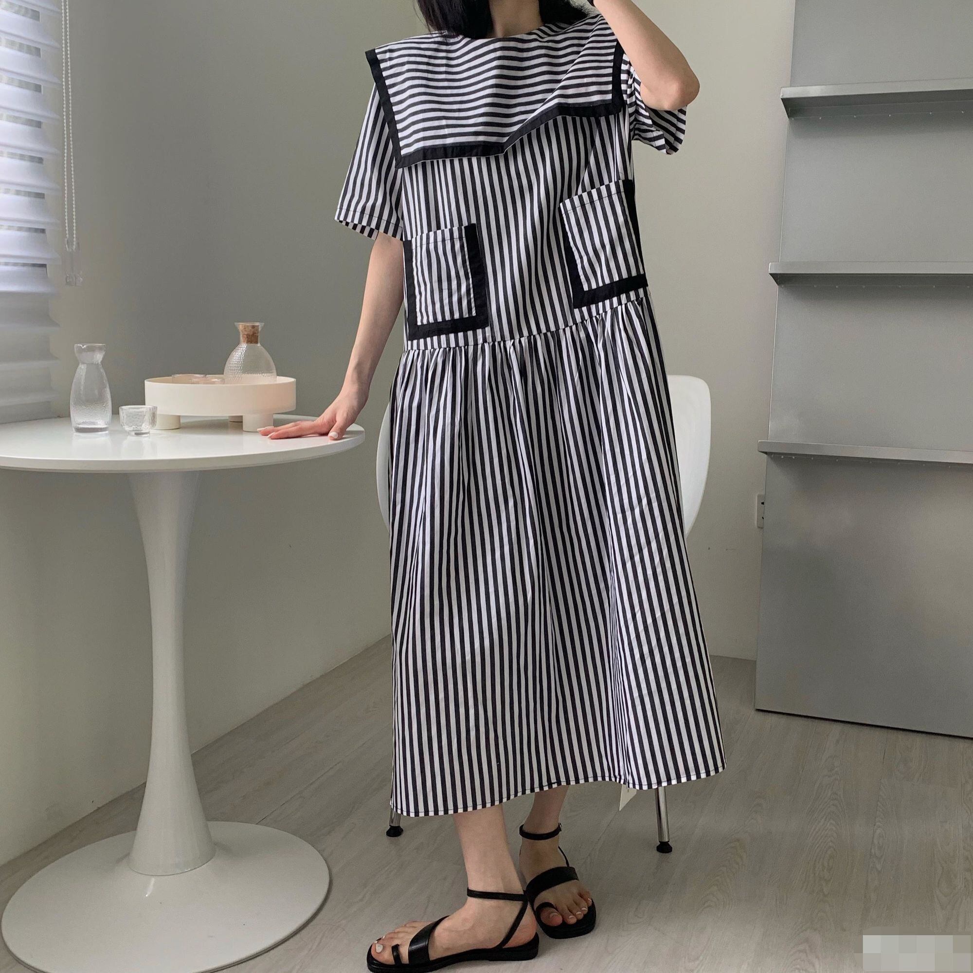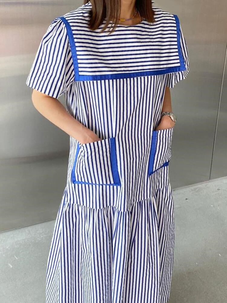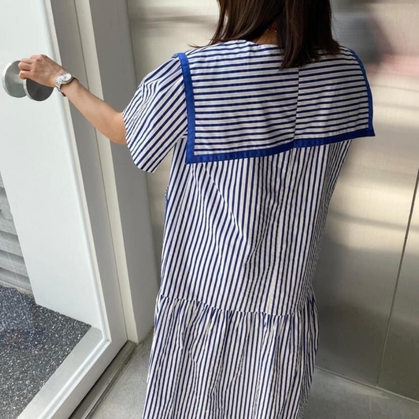 [EWQ] セーラー襟ストライプシャツドレスダブルポケットパッチワークコントラストルーズドレス夏 Vestido サマー 夏物