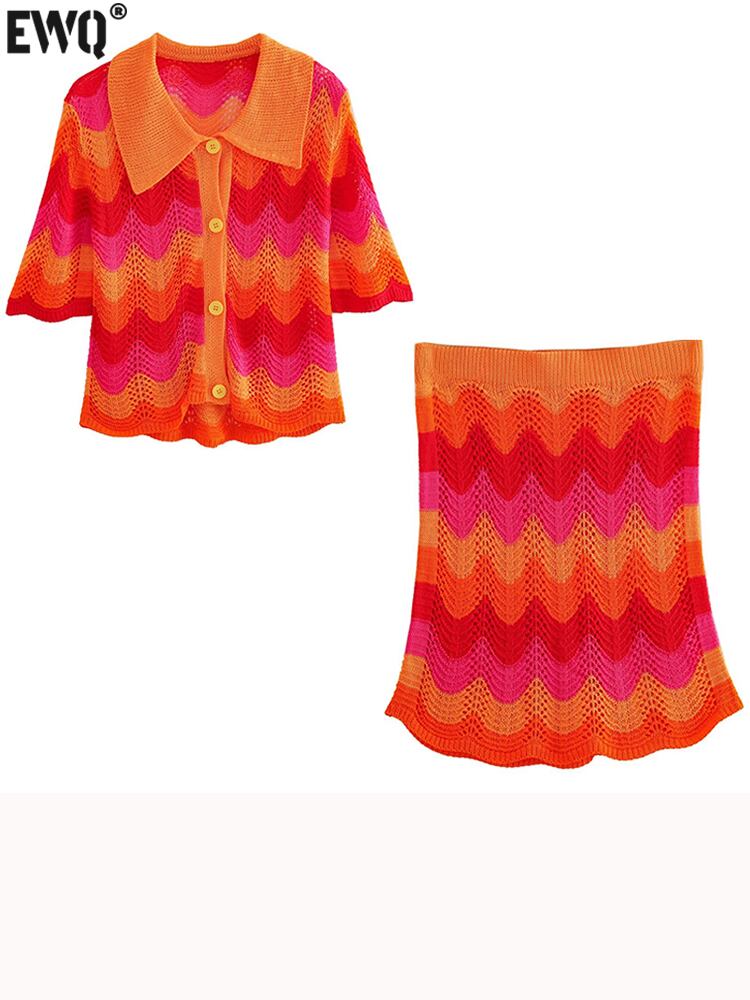[EWQ] 甘いルーズ 2 点セットニットシングルブレスト半袖プリントニットスカートショートトップス夏 16U1222K3L ハーフスリーブ 大人ガーリー スウィート キュート カジュアル サマー 夏物