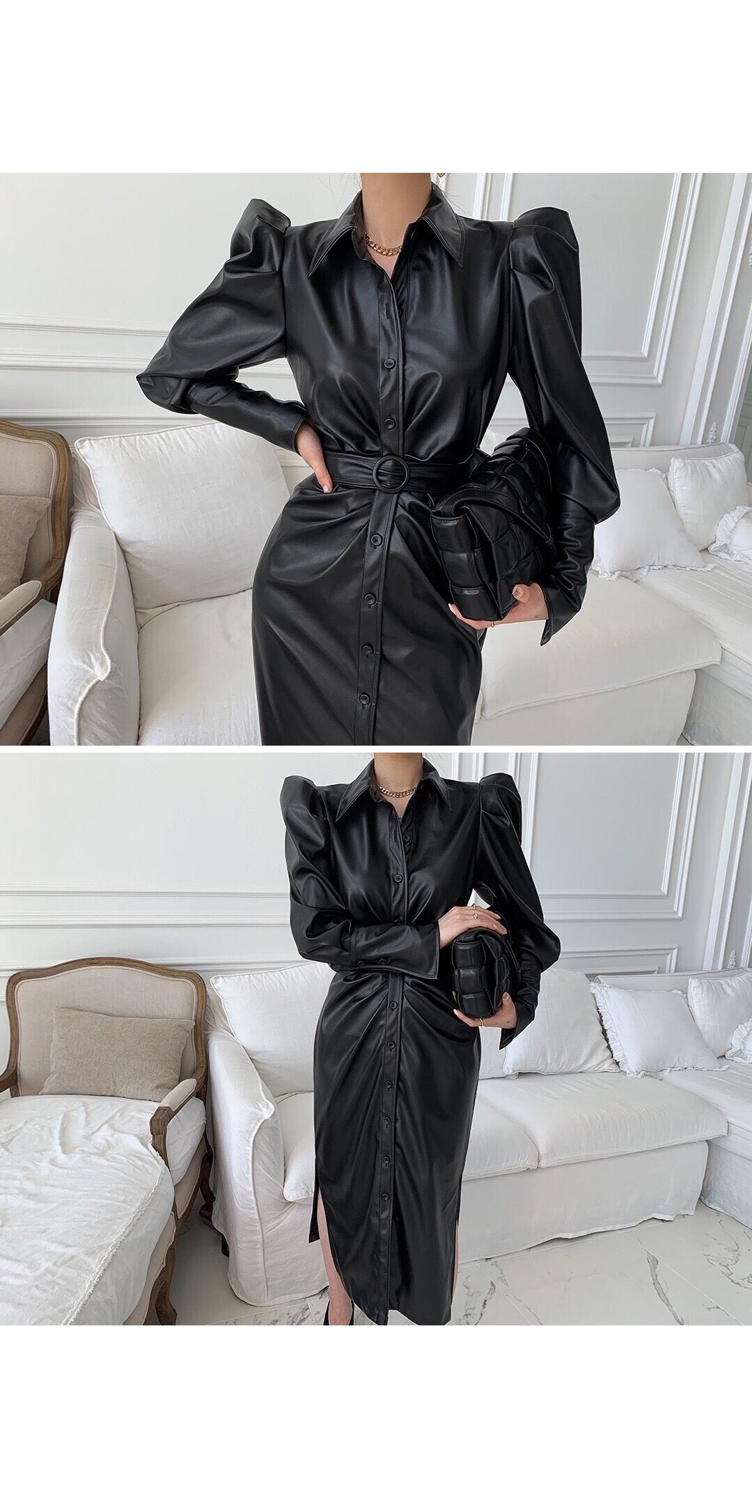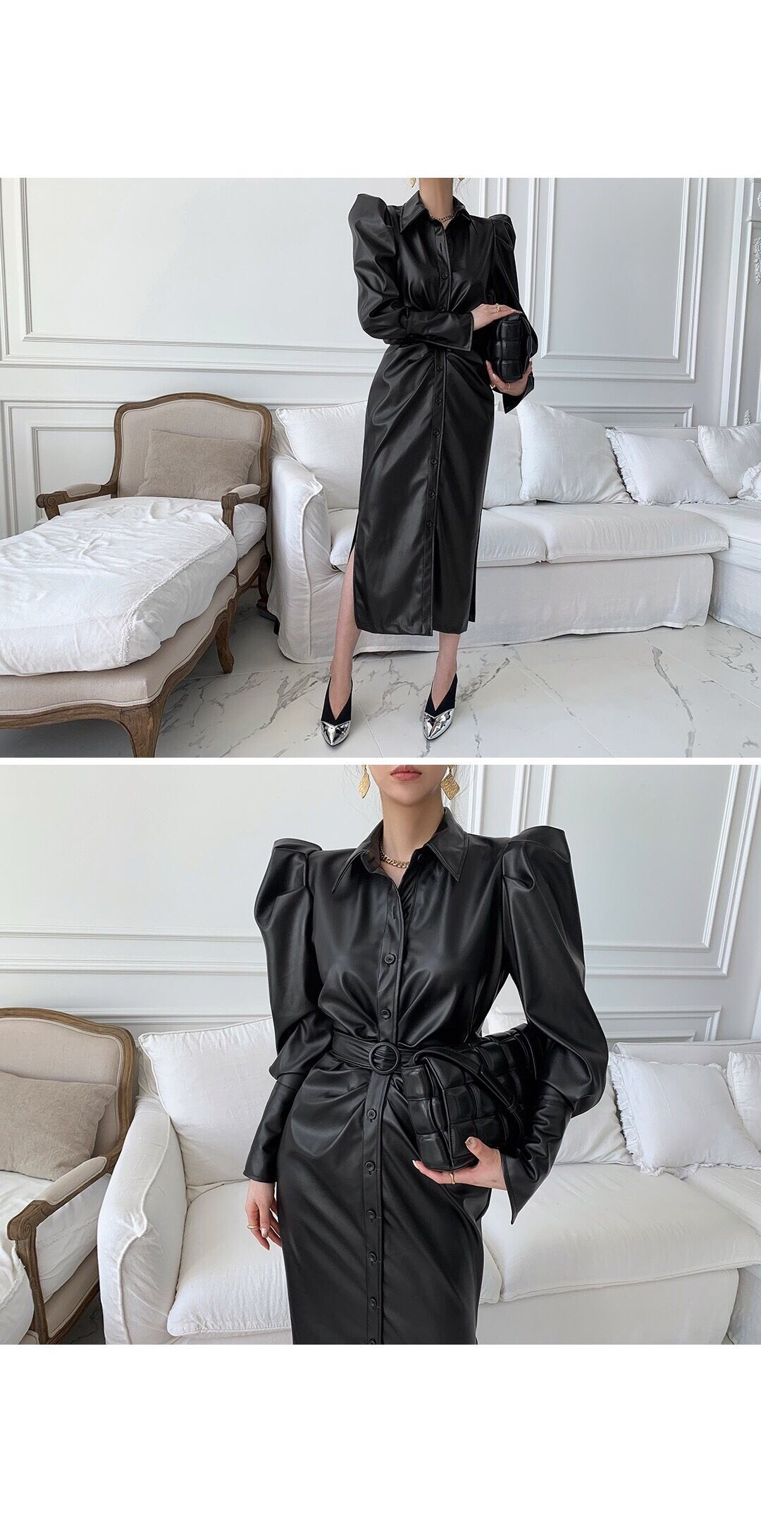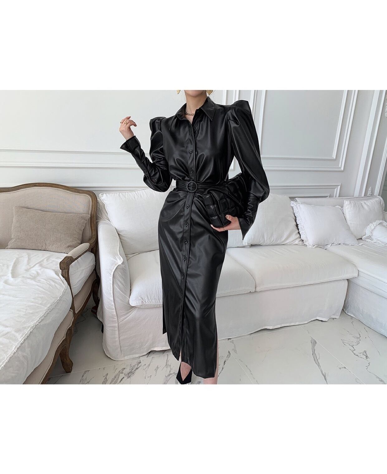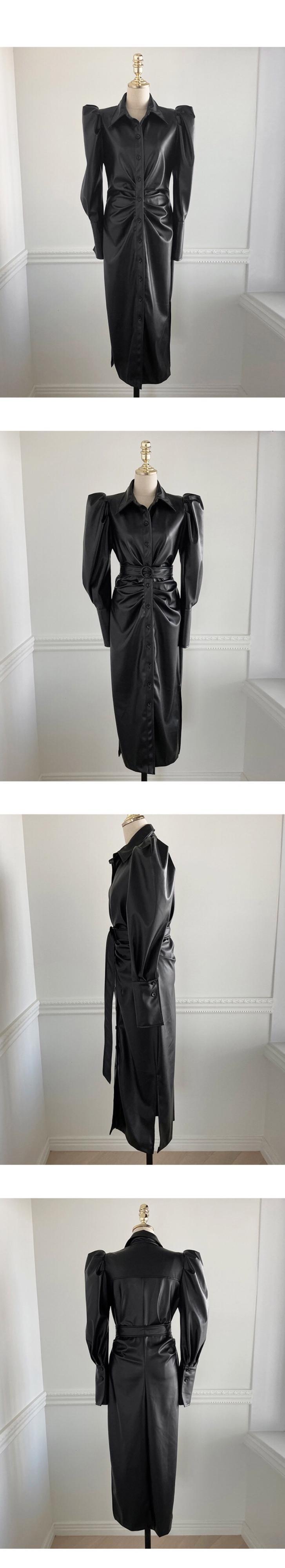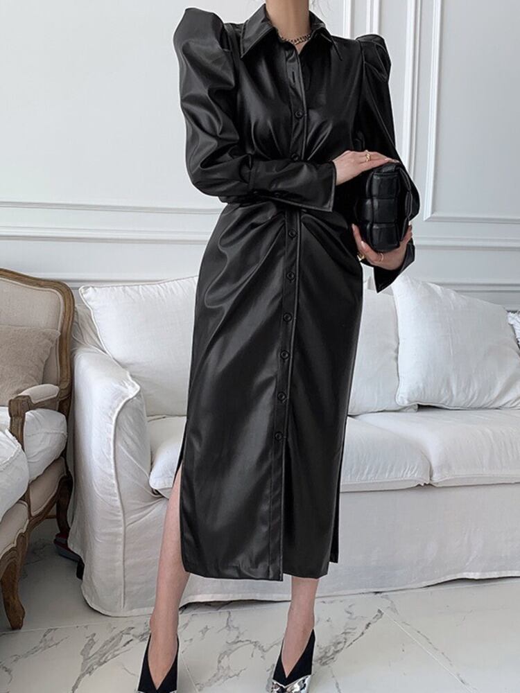[EWQ] 気質ブラック PU レザードレスラペルシングルブレストベルトスプリットドレス秋潮 Vestido オータム 秋物 ハーネス