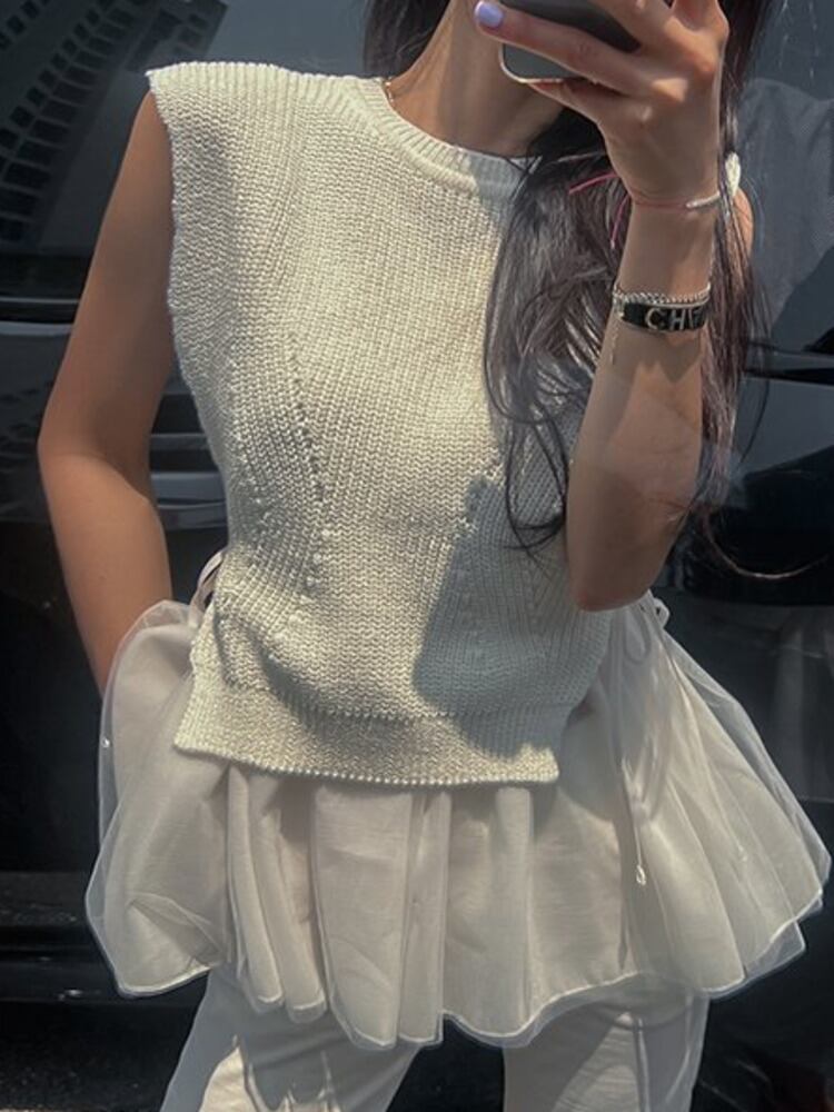 [EWQ] メッシュフリルベスト + O ネックタイボウニットタンクトップ夏潮ツーピーススーツ 16U1172 リボン サマー 夏物 Oネック