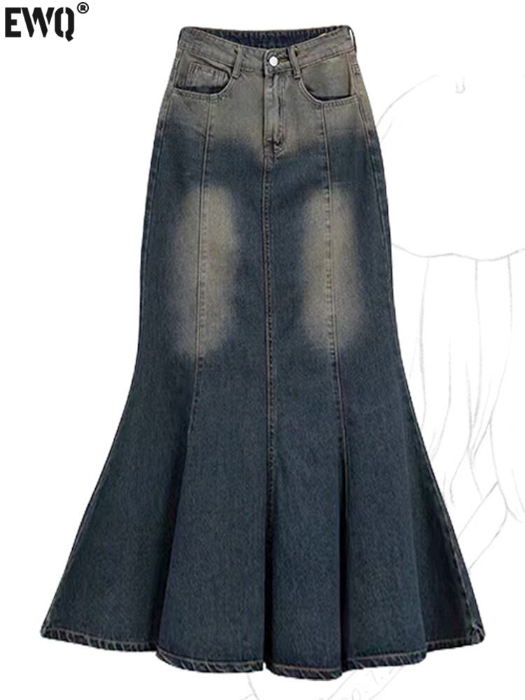 [EWQ] グラデーションラップヒップデニムスカートウエストパッチワークフリルトランペットミッドカーフスカートストリート夏潮服 サマー 夏物