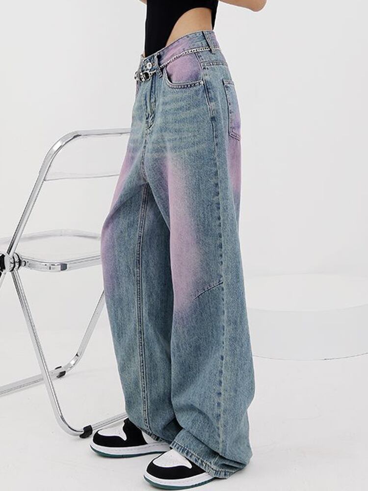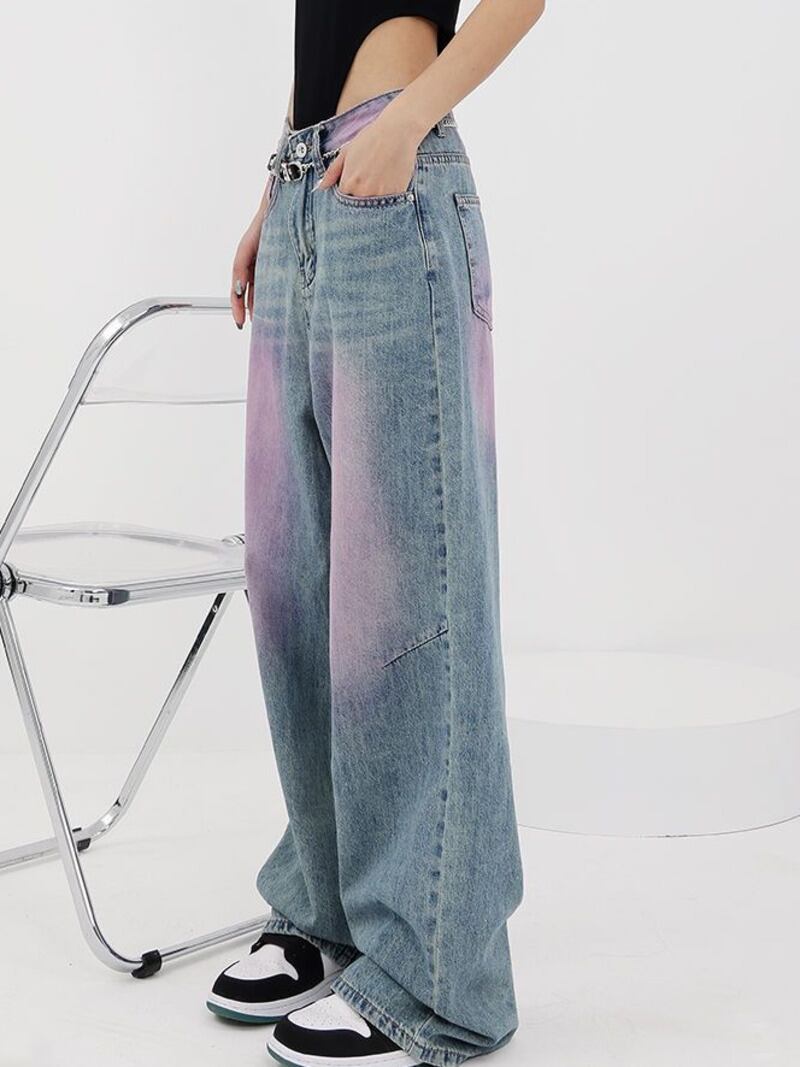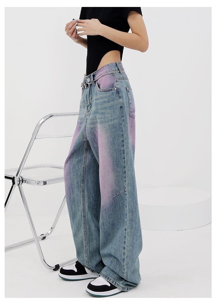 [EWQ] パープルグラフィティストリートジーンズウエストポケットコントラストカラーワイドレッグデニムパンツ秋潮 U939 オータム 秋物 ワイドパンツ