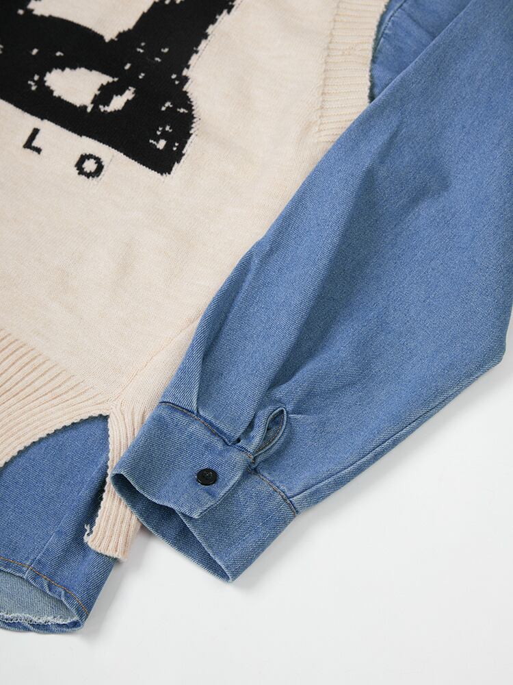 [EWQ] レタープリント装飾セーターパッチワークフェイクツーピースデニムスプライスニット秋潮プルオーバートップ オータム 秋物