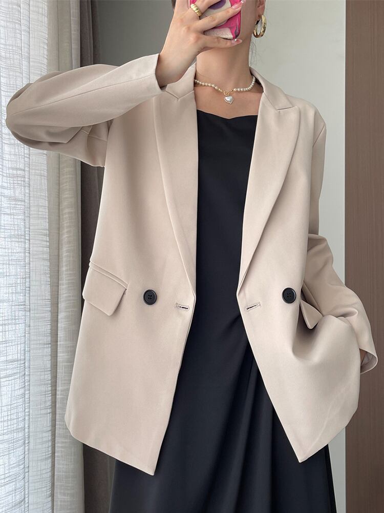 [EWQ] オフィスダブルブレスト長袖ブレザージャケットノッチルーズスーツコート秋トレンド ロング オータム 秋物 会社 学校 通勤や通学にも