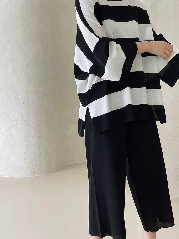 [EWQ] ストライプニットツーピーススーツ肩袖ルーズセーター + ウエストパンツ秋薄いセット オータム 秋物