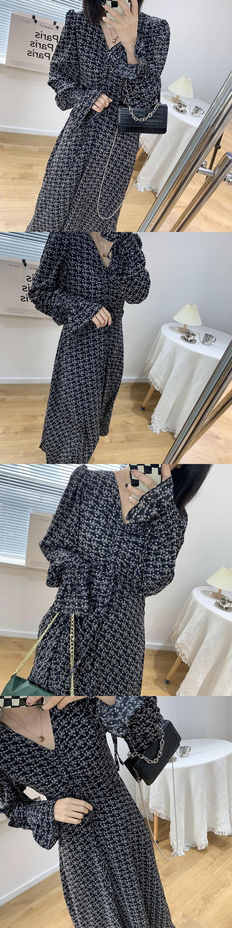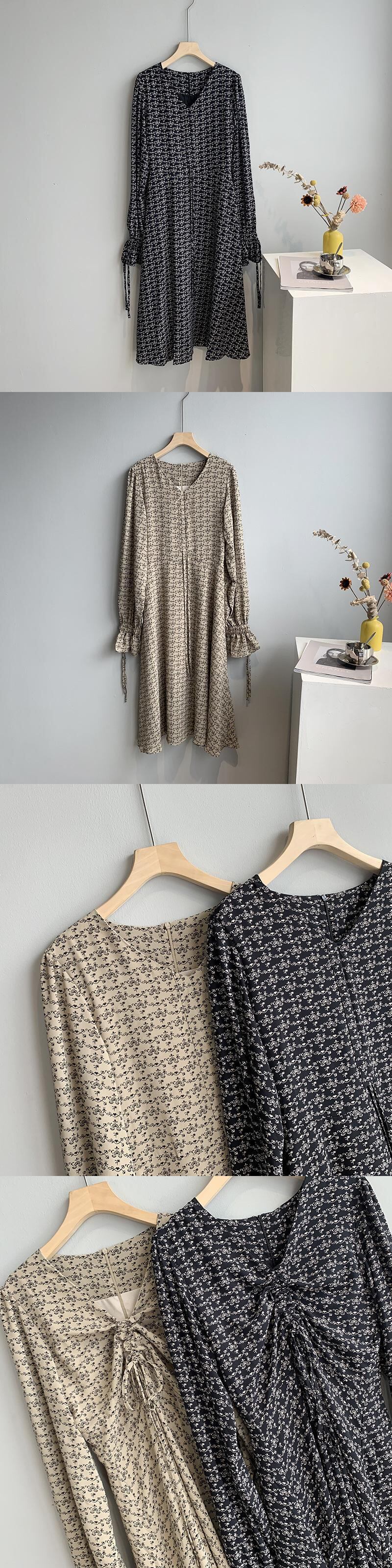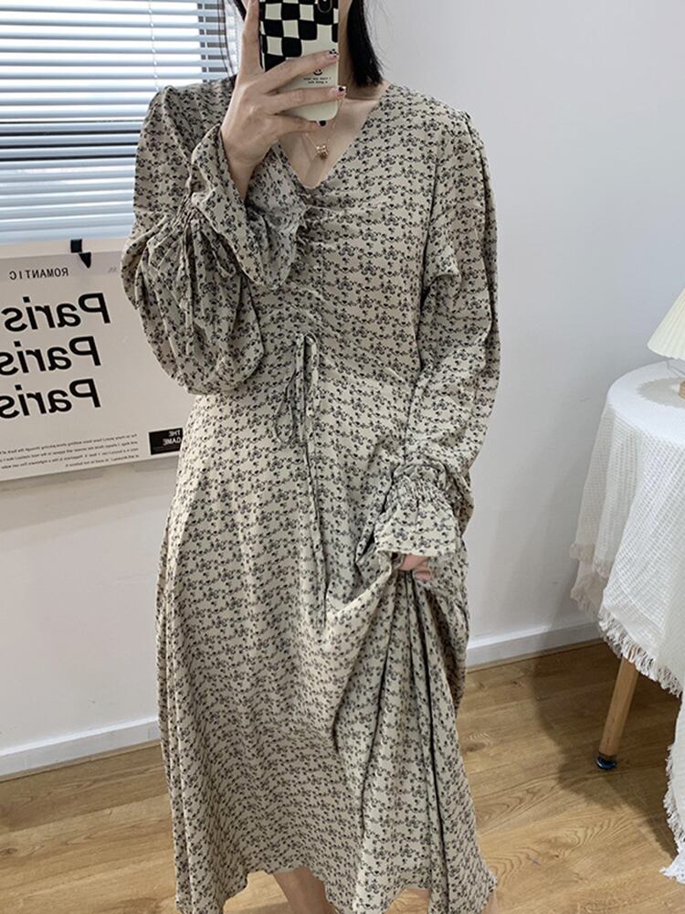 [EWQ] プリントコントラストシフォンドレス長袖 V ネックレースアップドレス秋潮 Vestido 3439 ロング オータム 秋物 Vネック