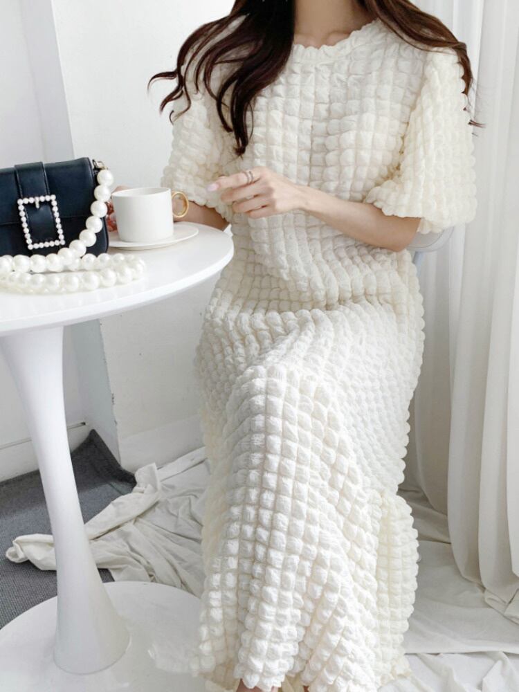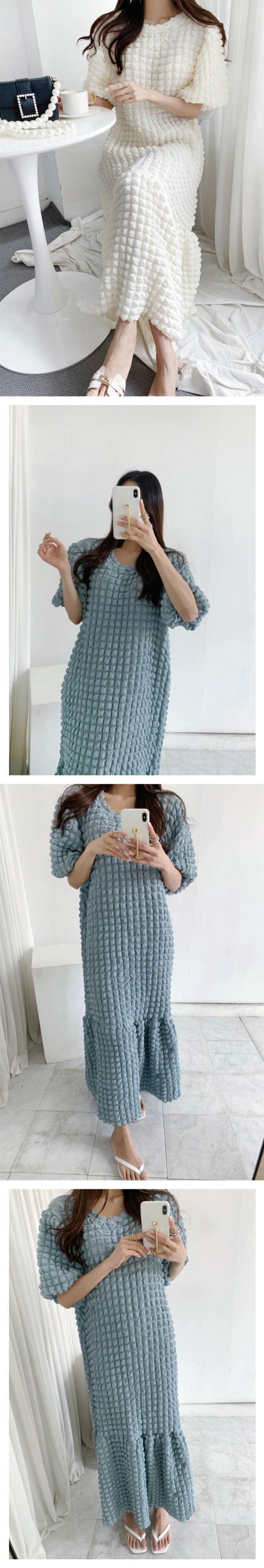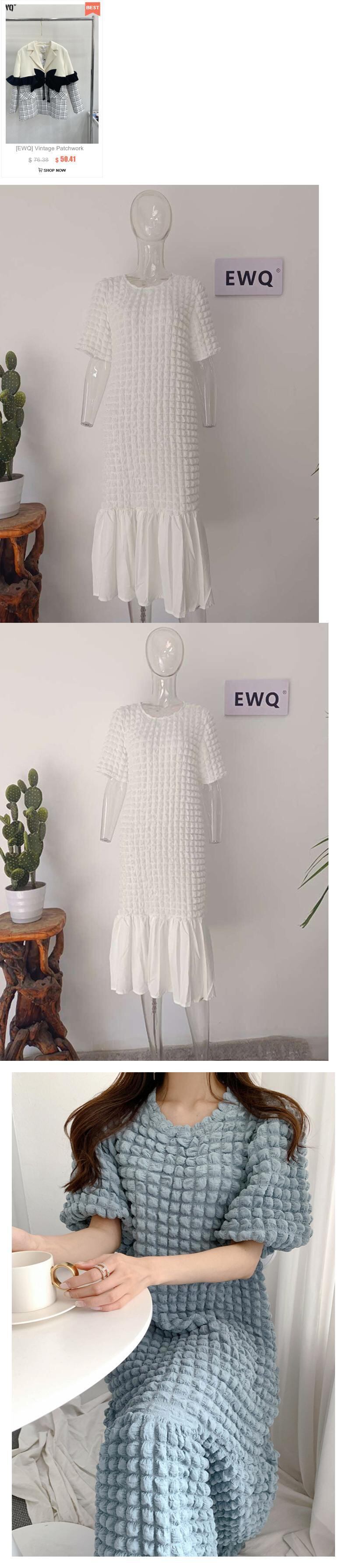 [EWQ] 甘いフリル裾ジャカードチェック柄ドレスパフスリーブ O ネックマキシドレスゆったり美しいローブ夏 大人ガーリー スウィート キュート カジュアル サマー 夏物 Oネック