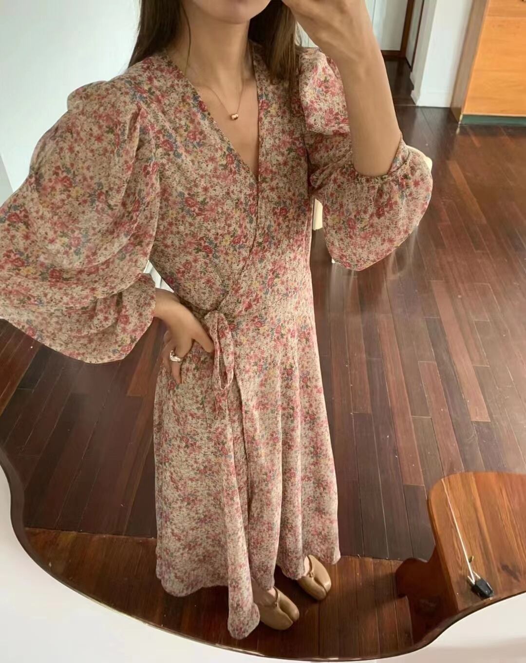 [EWQ] プリントコントラストレースアップドレスランタンスリーブ V ネックシフォン丈ドレス秋潮 Vestido オータム 秋物 Vネック