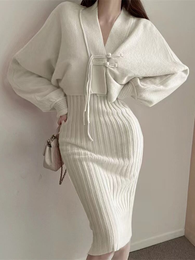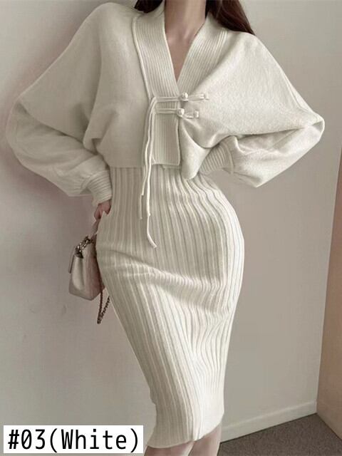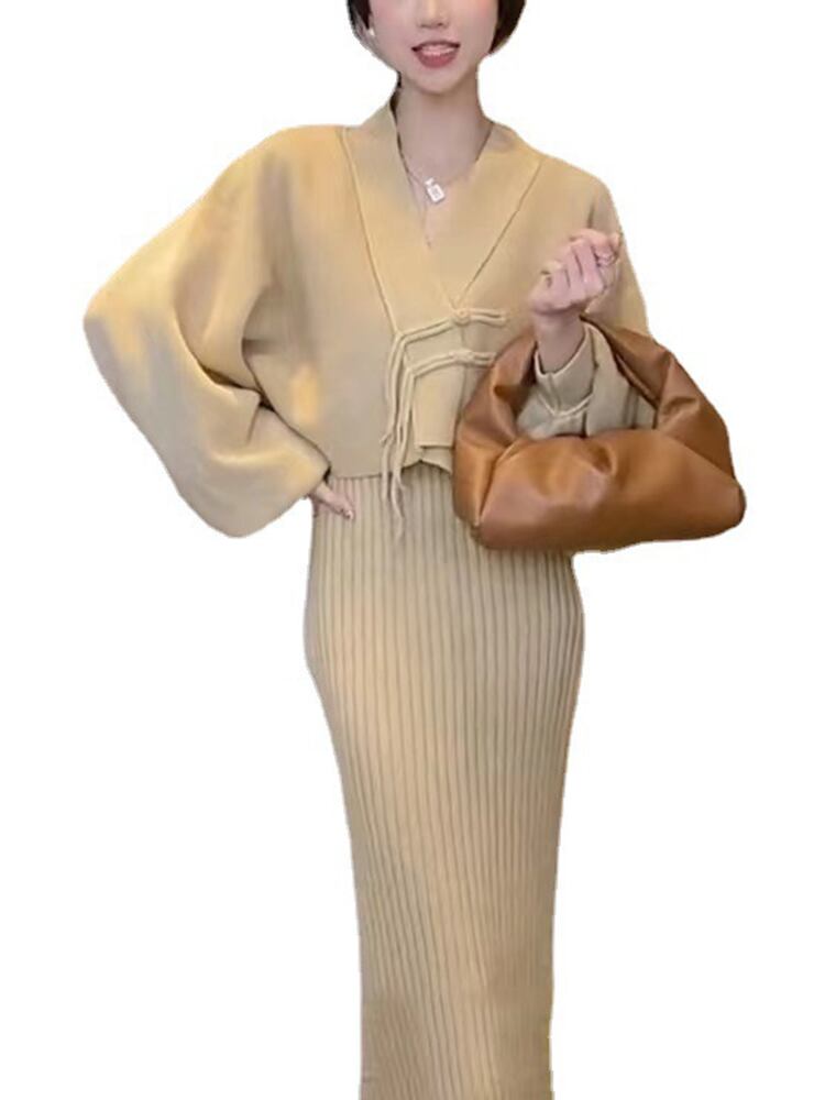 [EWQ] ニットツーピーススーツ長袖カーディガンコート + スリム弾性セータードレス秋潮ニットスーツ ロング エラスティック 伸縮 オータム 秋物