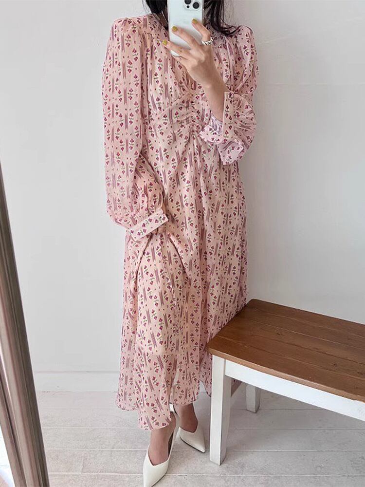 [EWQ] 甘い気質ドレスプリント V ネックバブルスリーブレースアップドレス秋潮長袖 Vestido 16U2529 ロング 大人ガーリー スウィート キュート カジュアル オータム 秋物 Vネック