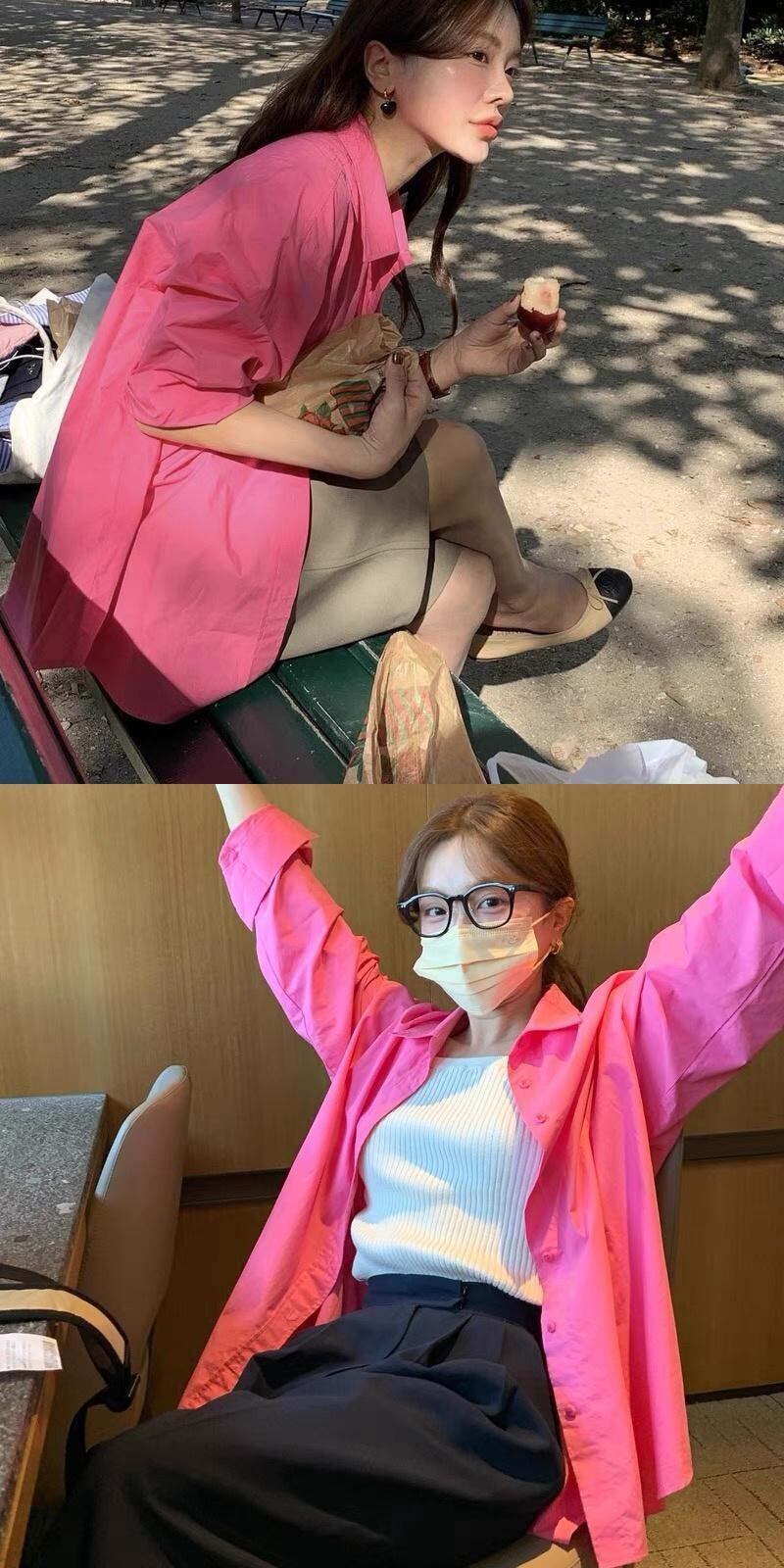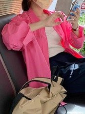 [EWQ] シックラペルシングルブレストルーズピンクシャツ長袖ブラウス秋トップストレンド 16O373 ロング オータム 秋物