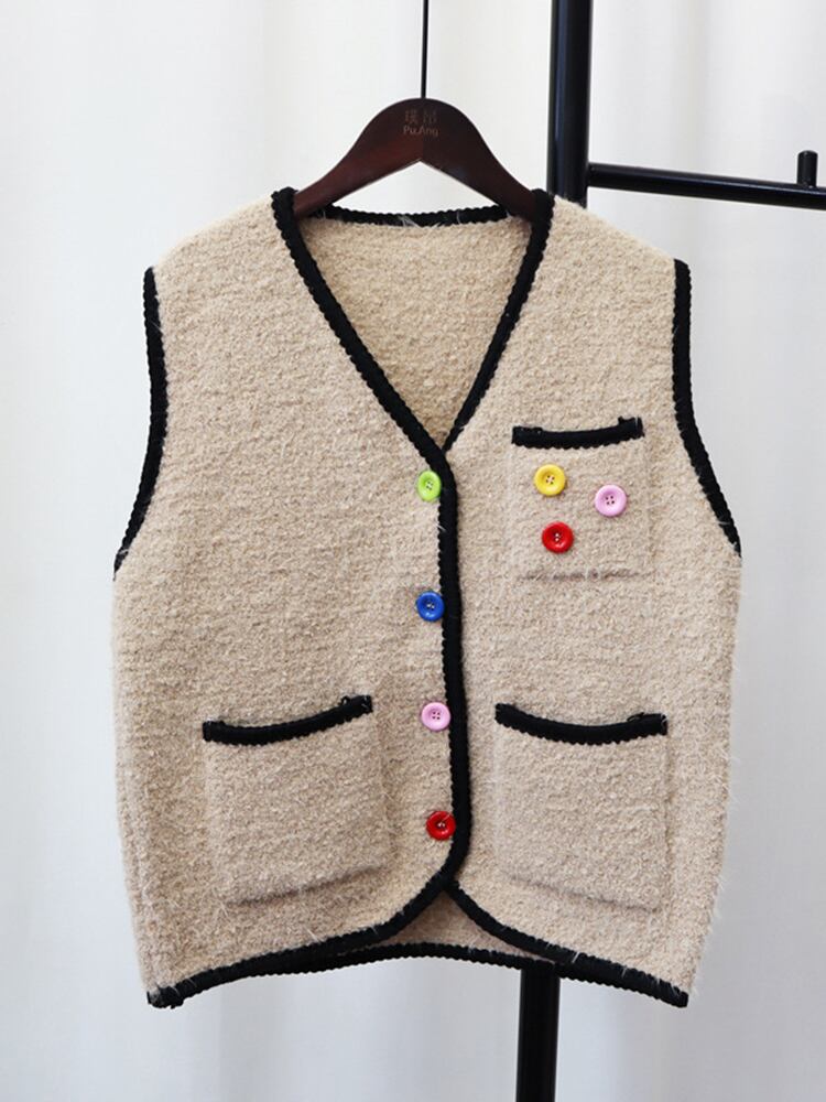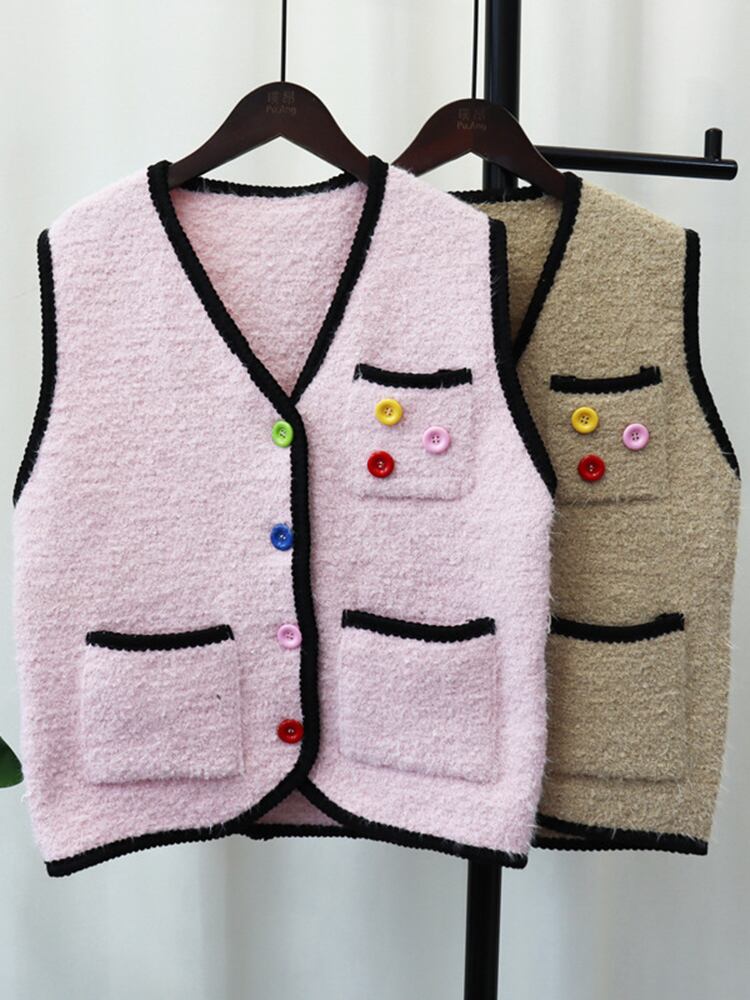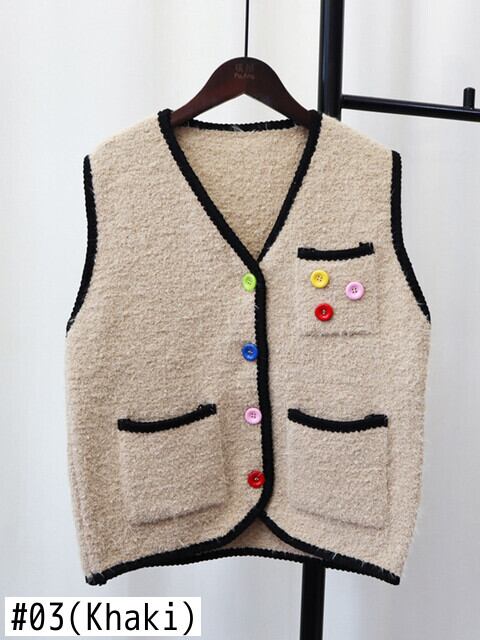 [EWQ] カラフルボタンセーターベストコントラストシングルブレストポケットニットタンクトップ秋潮ノースリーブトップ 40 オータム 秋物