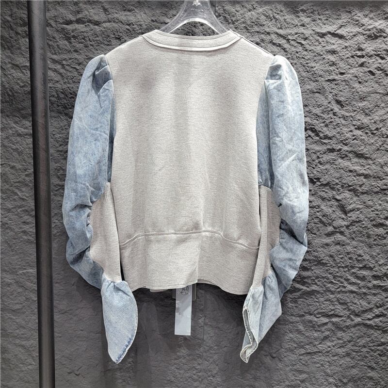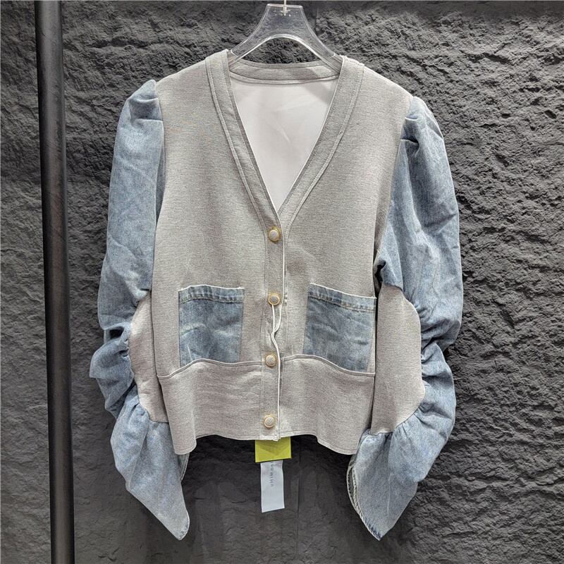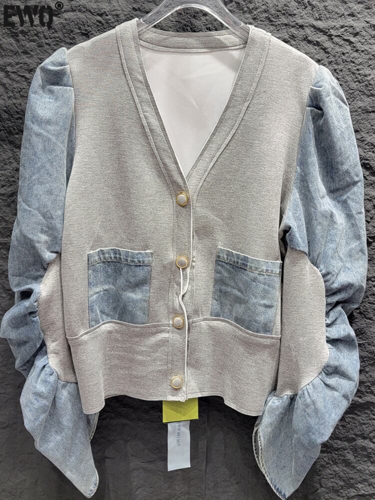 [EWQ] パッチワークジャケットプリーツ長袖スプライスデニム V ネックルーズストリートジャケットコート秋冬コート ロング オータム 秋物 ウィンター 冬物 Vネック