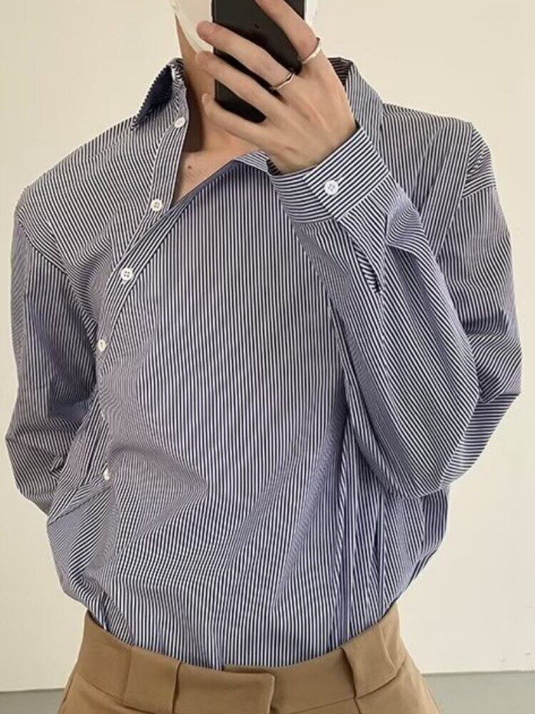 [EWQ] 非対称シングルブレストストライプシャツ長袖ルーズラペル秋潮トップ 16U1089 ロング オータム 秋物