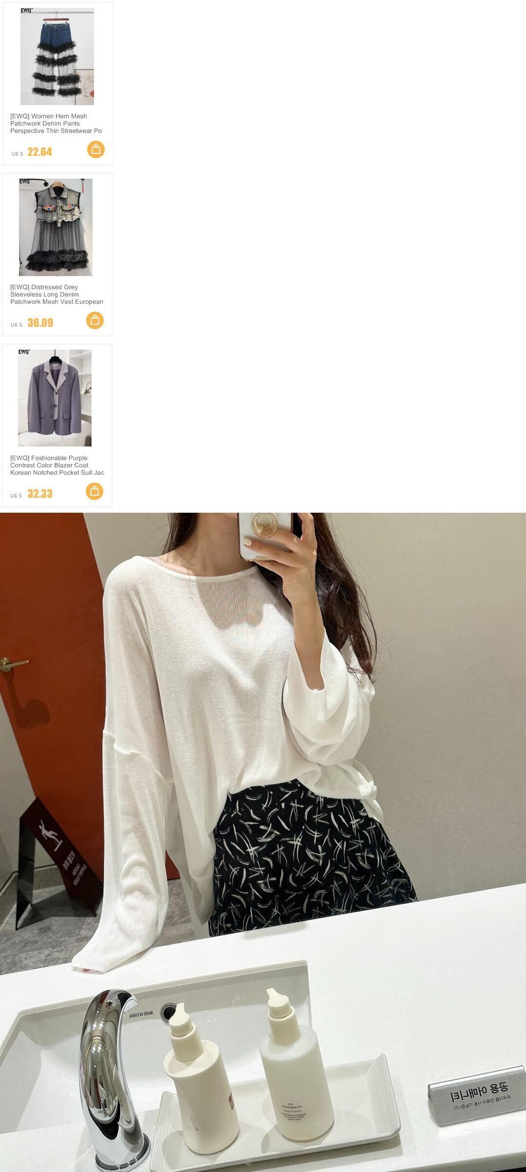 [EWQ] O ネック緑服長袖薄いルーズニットトップスピンクプルオーバーセーター秋 ロング オータム 秋物 Oネック グリーン