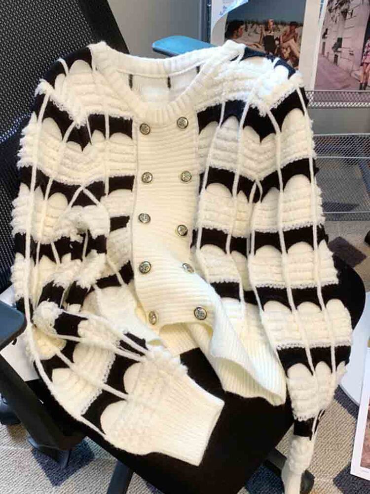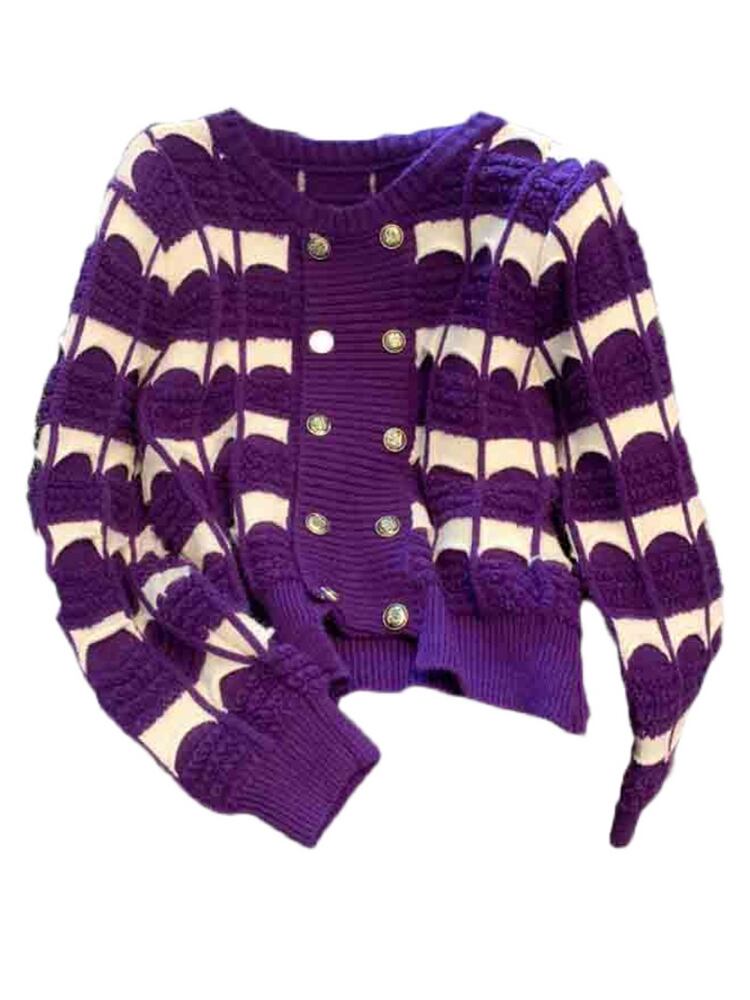 [EWQ] コントラストカラーストライプセーターダブルブレストルーズセータージャケット秋潮ニットコート 3185 オータム 秋物