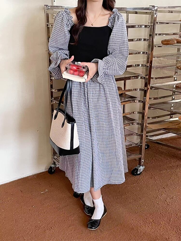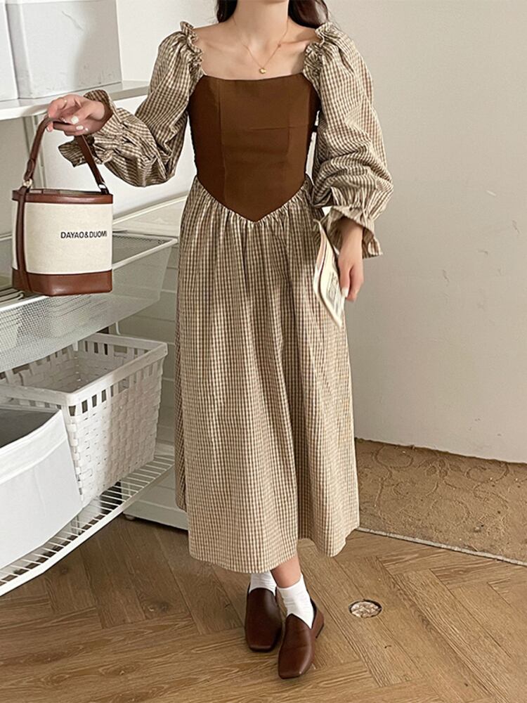 [EWQ] スクエアネックコントラストカラーチェック柄ドレスプリーツウエストフレアスリーブドレス秋潮 Vestido オータム 秋物 スクウェア