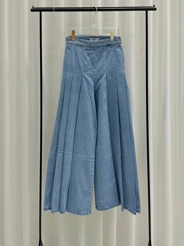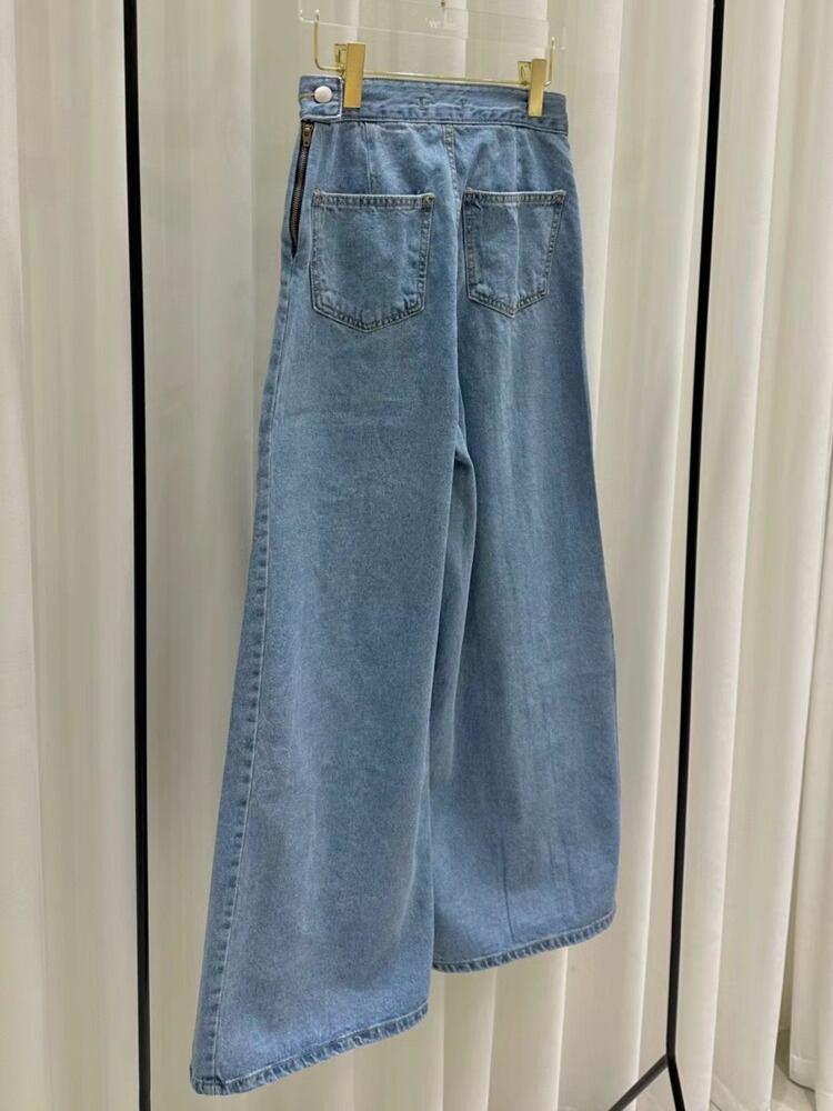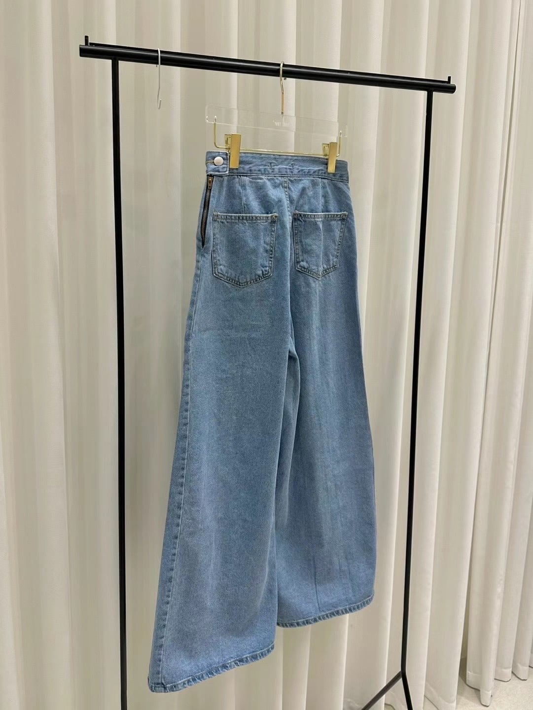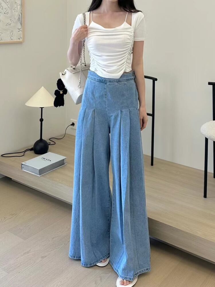 [EWQ] シックウエストバックルプリーツルーズデニムパンツストリートワイドレッグジーンズ秋 16O382 オータム 秋物 ワイドパンツ