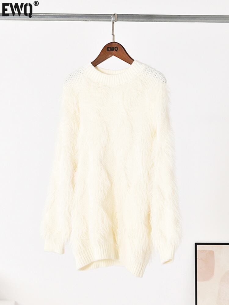 [EWQ] O ネックミンクベルベットパッチワークセータープルオーバー秋シンプル長袖ニットプルオーバートップス ロング オータム 秋物 Oネック