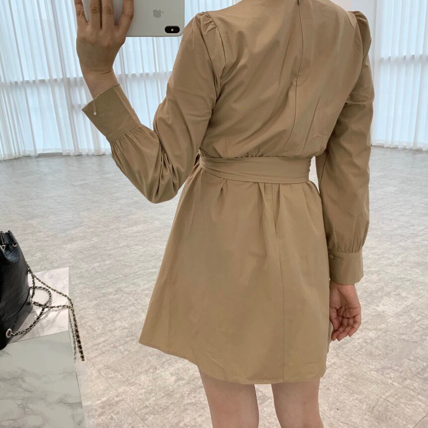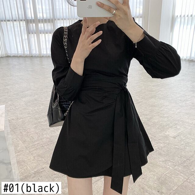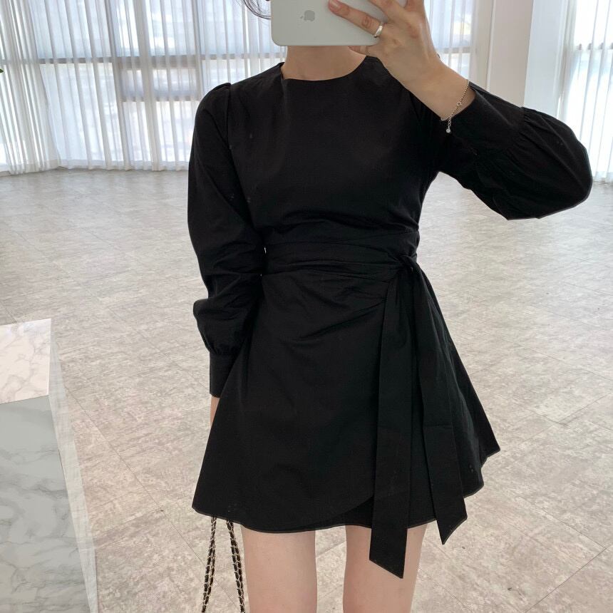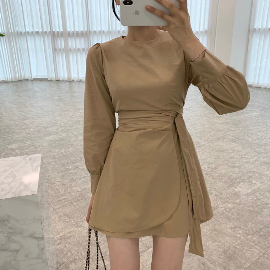[EWQ] レースアップミニドレス O ネック長袖ソリッドパッチワークドレス秋潮 Vestidos ロング オータム 秋物 Oネック ソリッドカラー