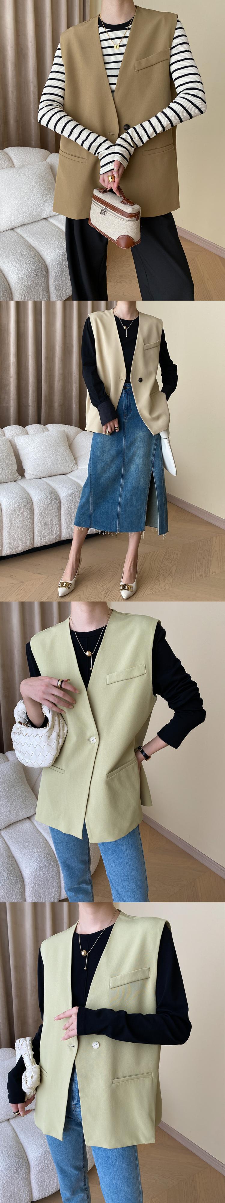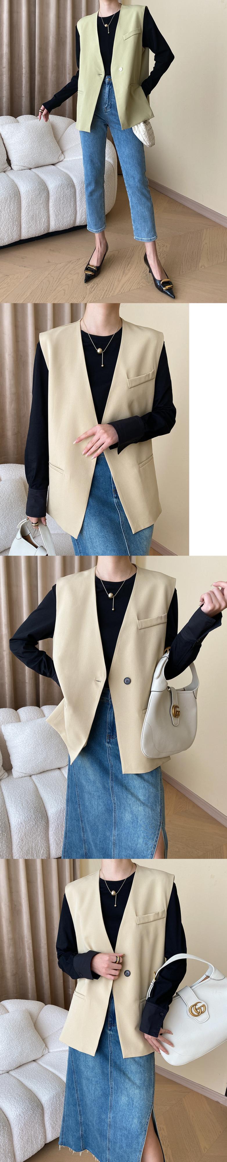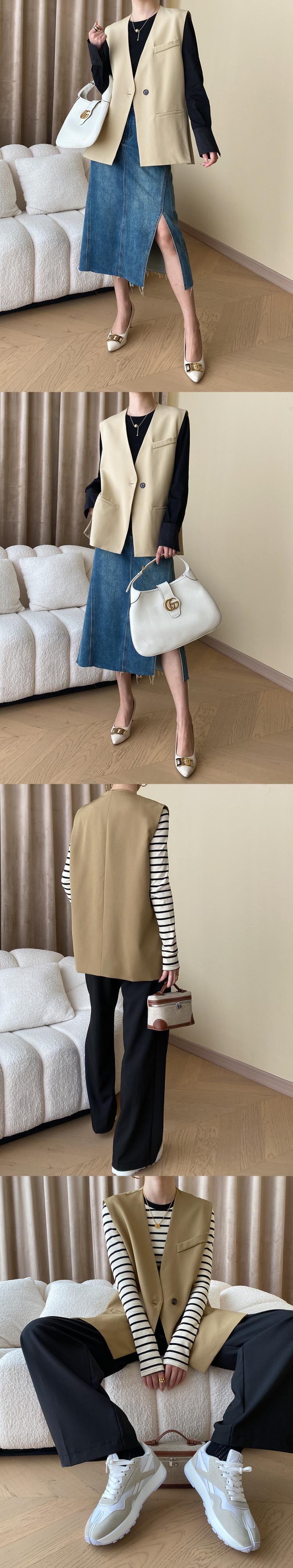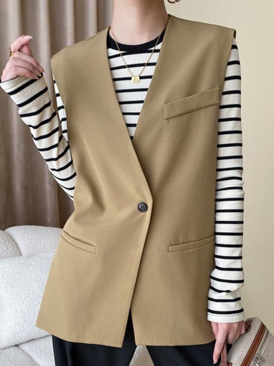 [EWQ] ワンボタンスーツベストアウターノースリーブジャケット秋オフィスレディカーキトップ服 6U2244 オータム 秋物 会社 学校 通勤や通学にも