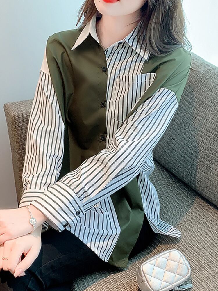 [EWQ] 非対称パッチワークストライプシャツ長袖シングルブレスト秋潮服 ロング オータム 秋物
