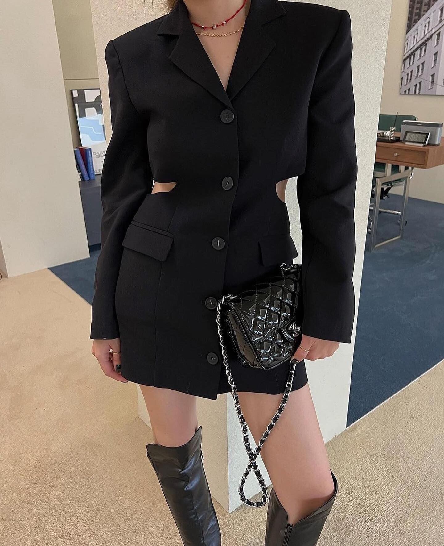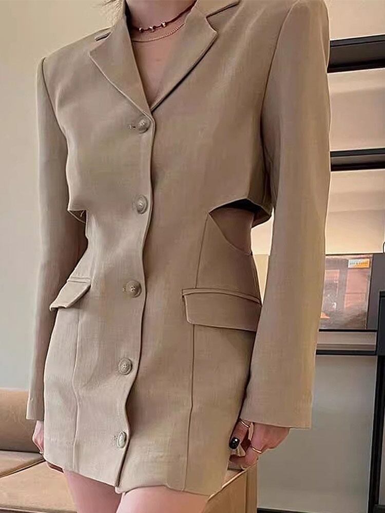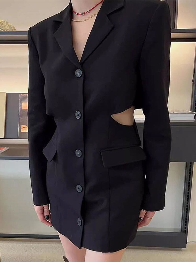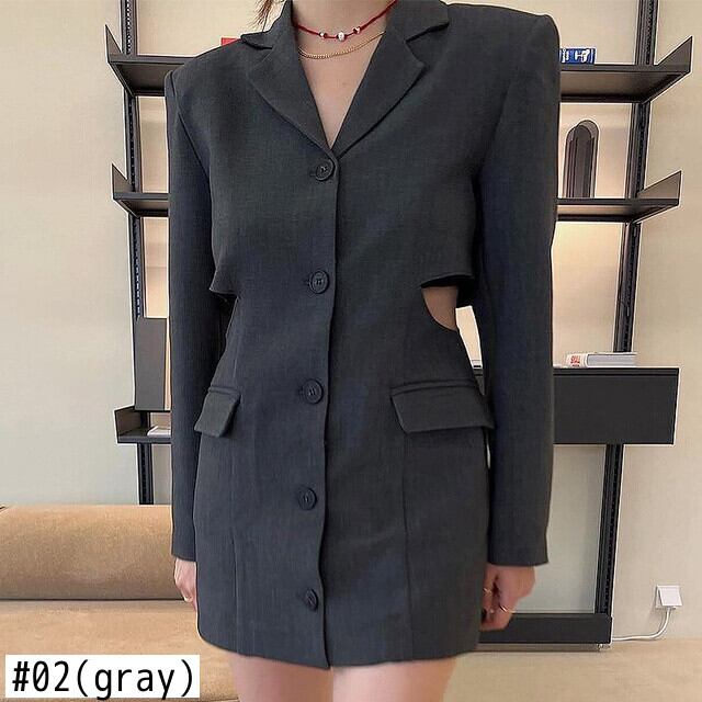 [EWQ] 秋ノッチ襟中空ウエストミニブレザードレス長袖シングルブレストスリムドレス ロング オータム 秋物