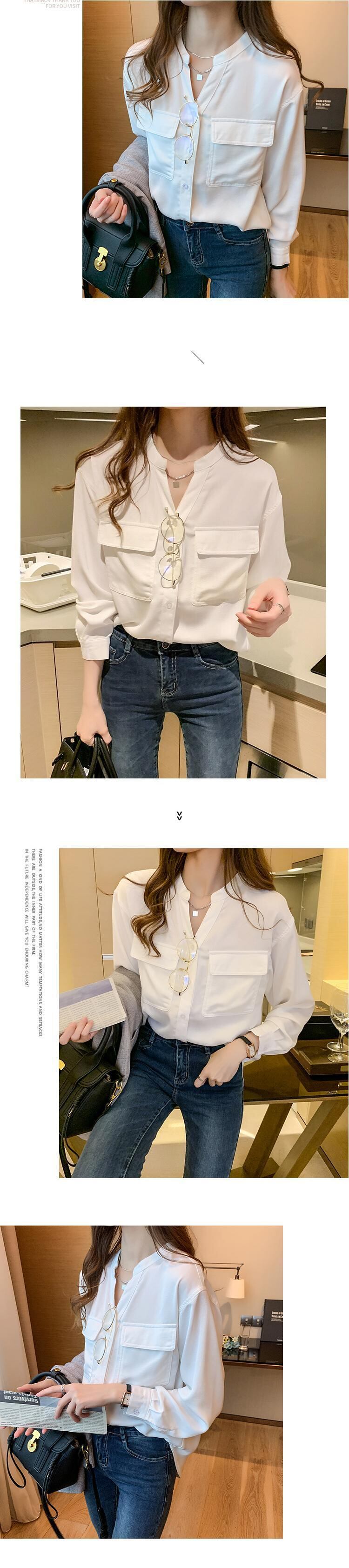 [EWQ] V ネック長袖ポケットパッチワークシフォンシャツシングルブレストブラウス秋 16O329 ロング オータム 秋物 Vネック