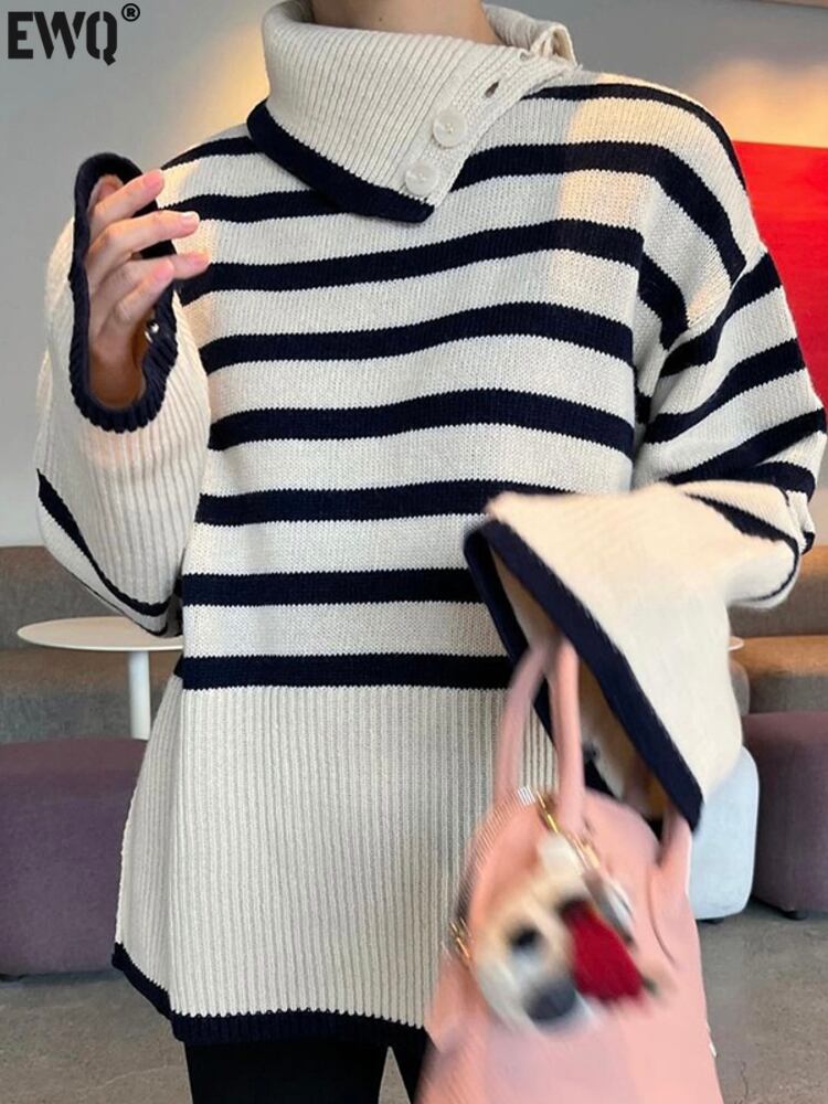 [EWQ] 不規則ラペルコントラストストライプセーター長袖ルーズプルオーバーニット秋潮トップ ロング オータム 秋物