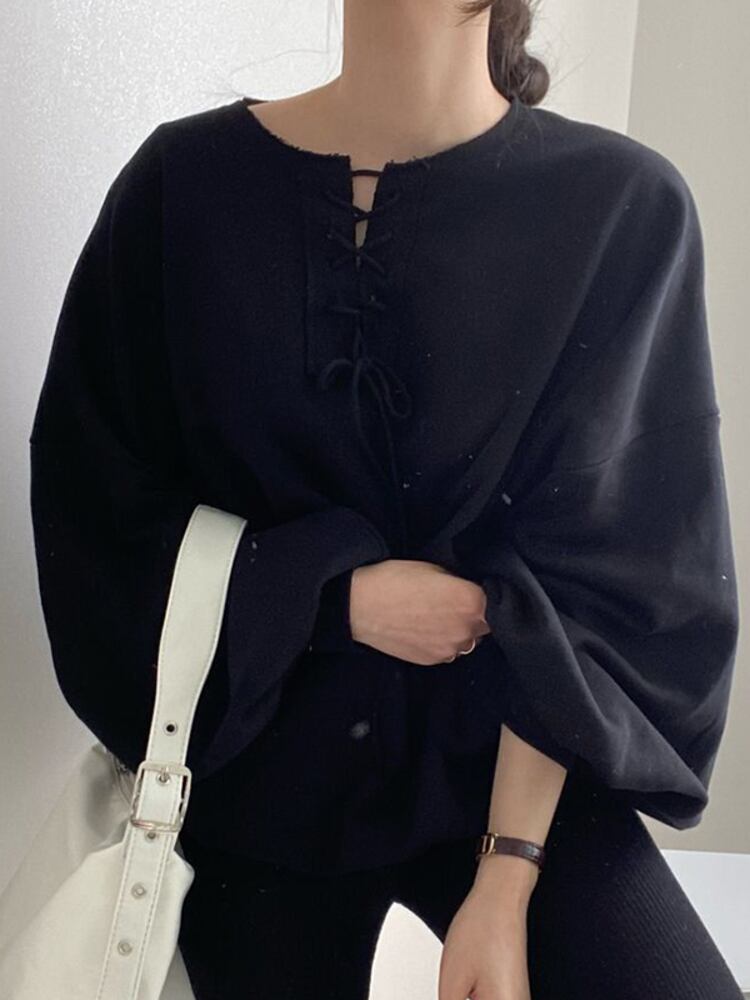 [EWQ] O ネッククロスネクタイボウスウェット長袖ルーズプルオーバートップ秋冬潮服 16U3725 ロング リボン シャツ オータム 秋物 ウィンター 冬物 Oネック