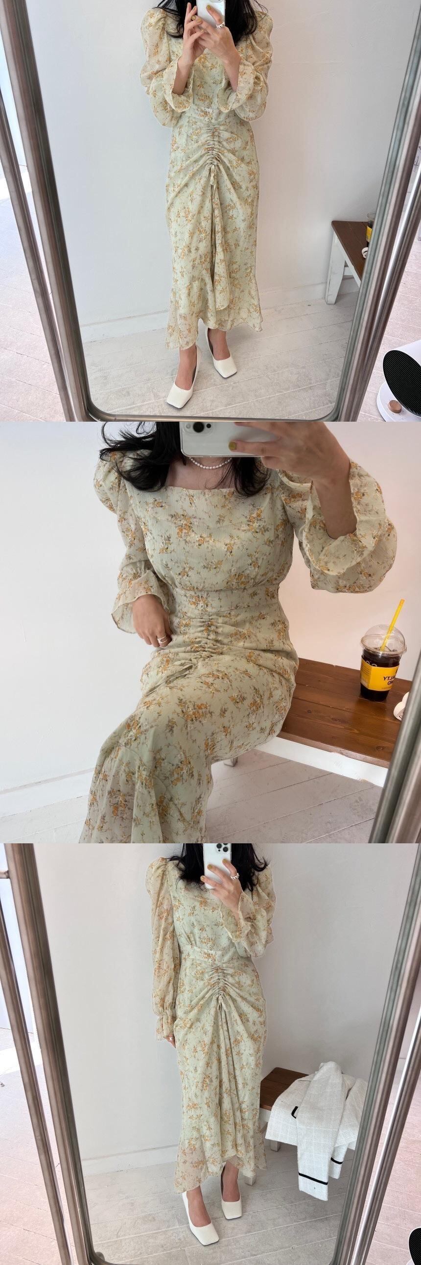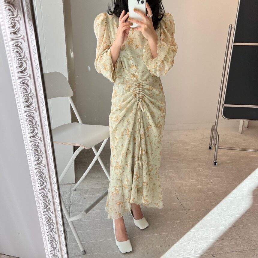 [EWQ] 花柄プリーツ巾着ドレスランタンスリーブコントラストスクエアネックドレス秋潮 Vestido オータム 秋物 スクウェア