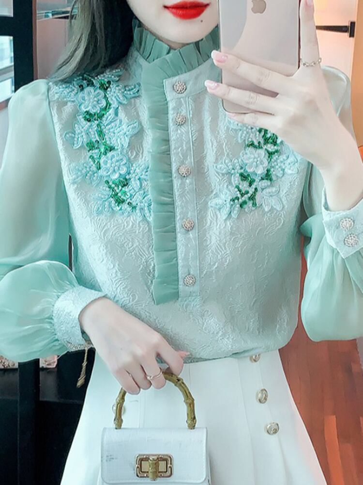 [EWQ] 刺繍シャツ レディース 長袖 スタンド菌 パッチワーク グリーン 秋潮 トップス ロング オータム 秋物