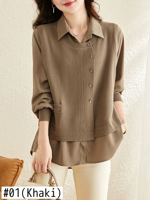 [EWQ] フェイクツーピースニットパッチワークシャツボタン装飾長袖秋潮トップ 2466 ロング オータム 秋物