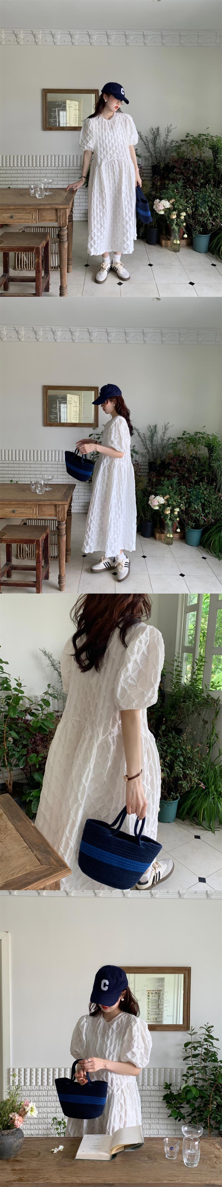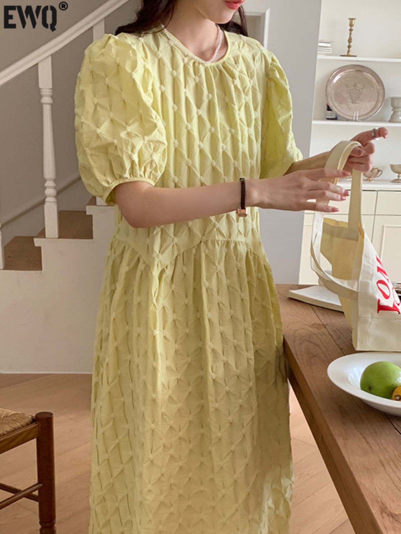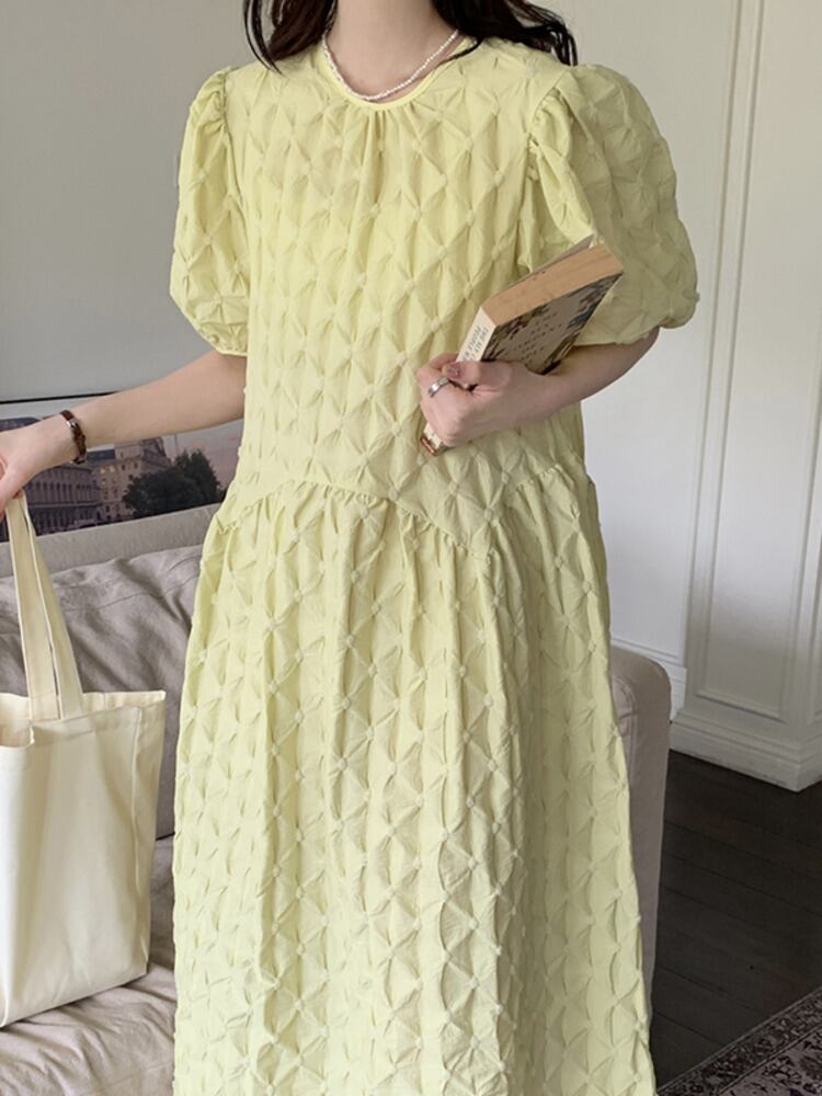 [EWQ] 3D ジャカードバブルチェック柄ソリッドカラードレスルーズパフスリーブ O ネックドレス夏潮 Vestidos サマー 夏物 Oネック