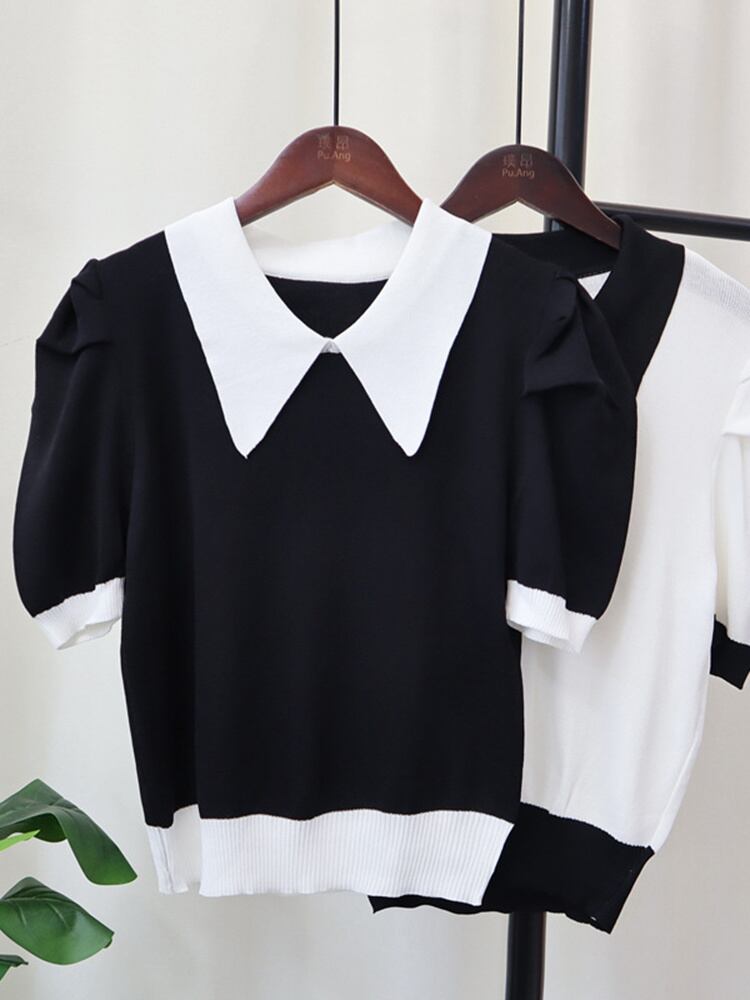 [EWQ] ターンダウンカラーニットプルオーバー 半袖セーター コントラストカラートップス 秋美人プルオーバーニット ショート ハーフスリーブ オータム 秋物