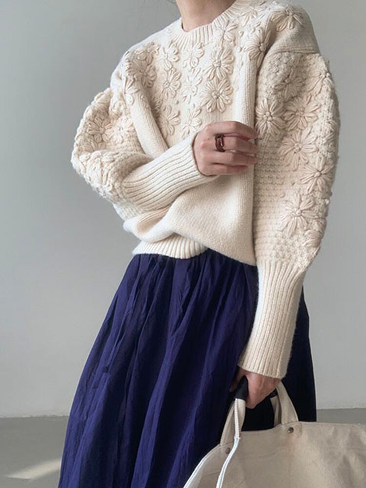 [EWQ] セーター O ネックランタンスリーブニットプルオーバートップス 3D 刺繍花ジャンパー秋冬 オータム 秋物 ウィンター 冬物 花柄 Oネック