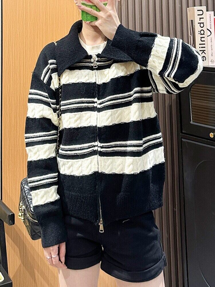 [EWQ] ブラックホワイトコントラストストライプカーディガンコート長袖ルーズ弾性セータージャケット秋冬 6U3690 ロング エラスティック 伸縮 オータム 秋物 ウィンター 冬物