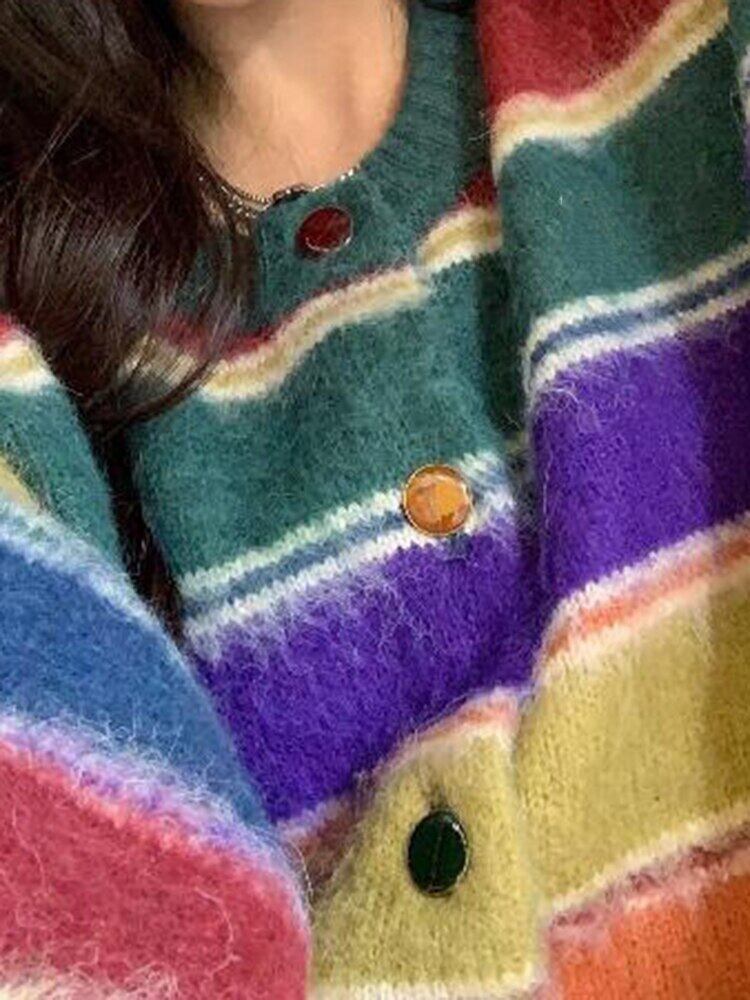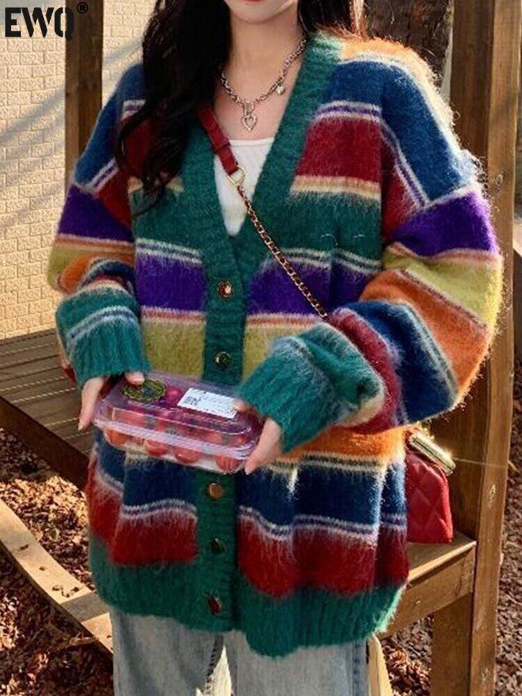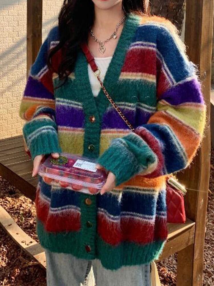 [EWQ] レインボーストライプコントラストカーディガンコート甘い V ネックシングルブレストルーズセータージャケット秋ニットコート 大人ガーリー スウィート キュート カジュアル オータム 秋物 Vネック