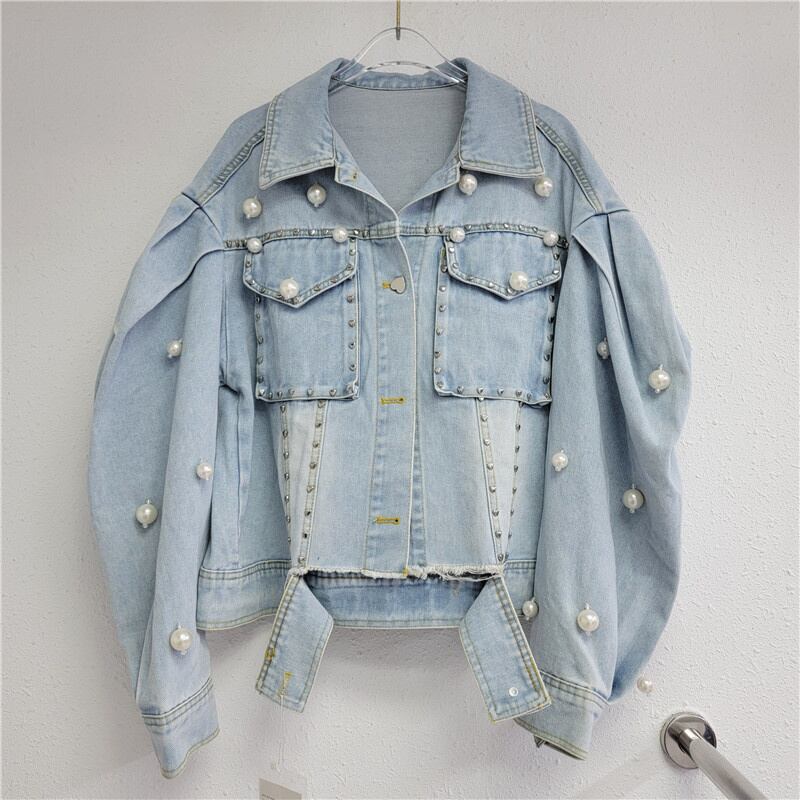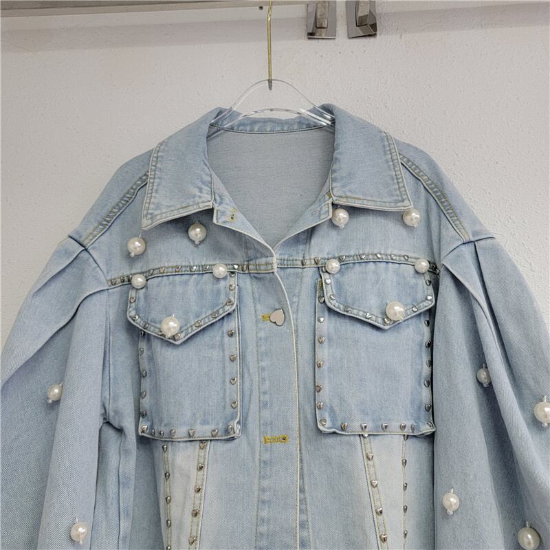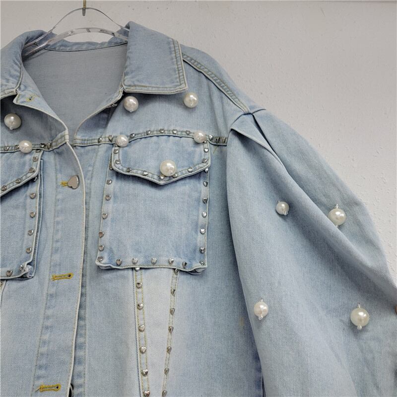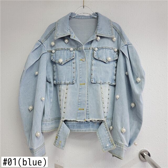 [EWQ] リベットパールデニムジャケット長袖ポケットパッチワークブルーカットアウトジャケットストリート秋潮コート 555 ロング オータム 秋物 真珠