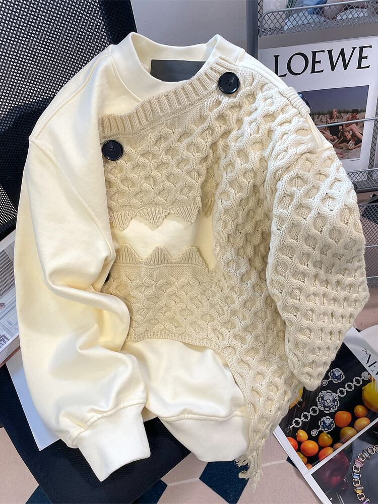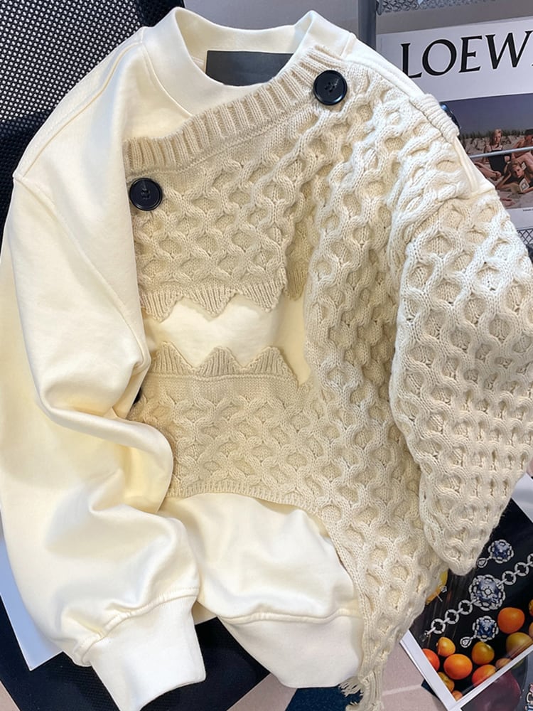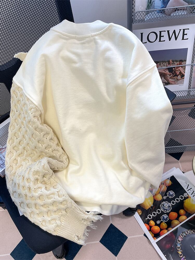 [EWQ] 不規則ニットパッチワークスウェット長袖ルーズ気質トップ冬秋服 ロング シャツ オータム 秋物 ウィンター 冬物