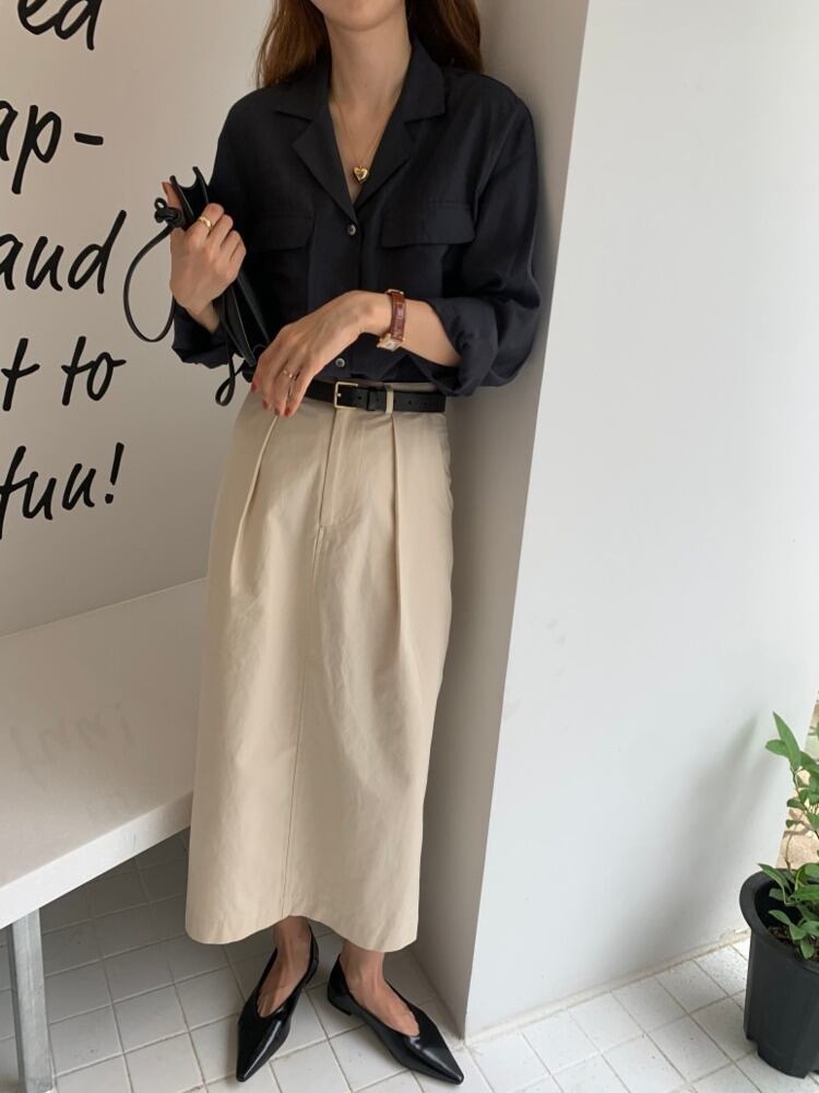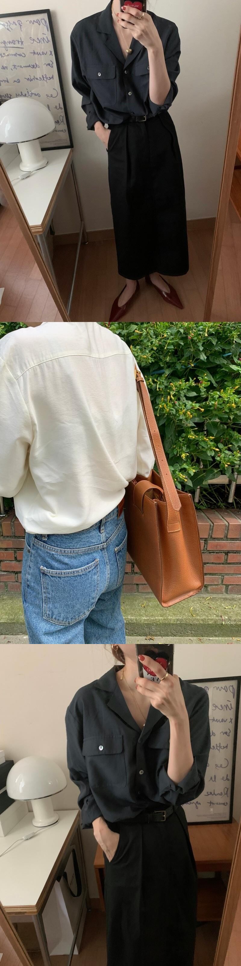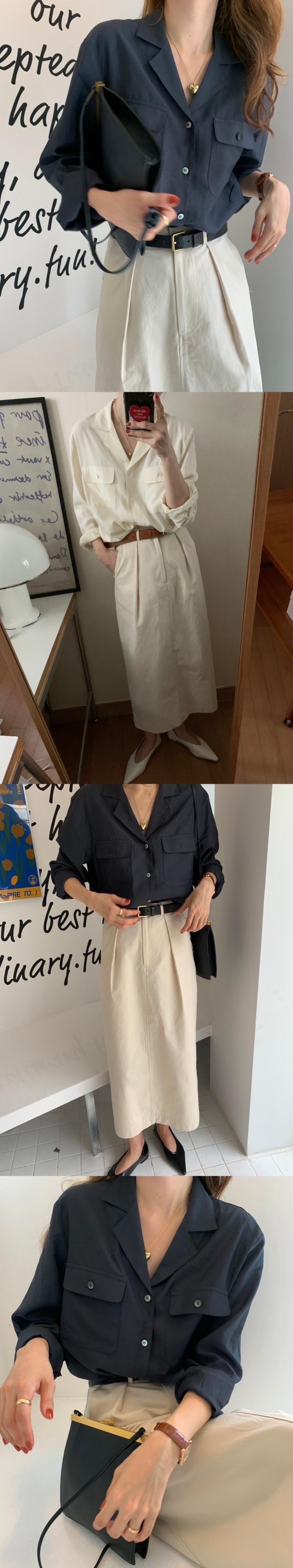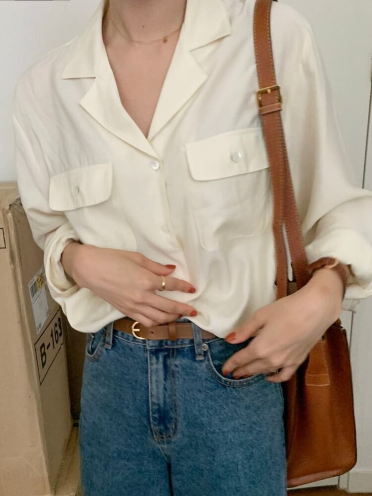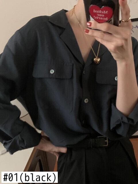 [EWQ] レトロ長袖ノッチ襟ルーズシャツ秋フラップポケットブラウストップ 16O410 ロング オータム 秋物